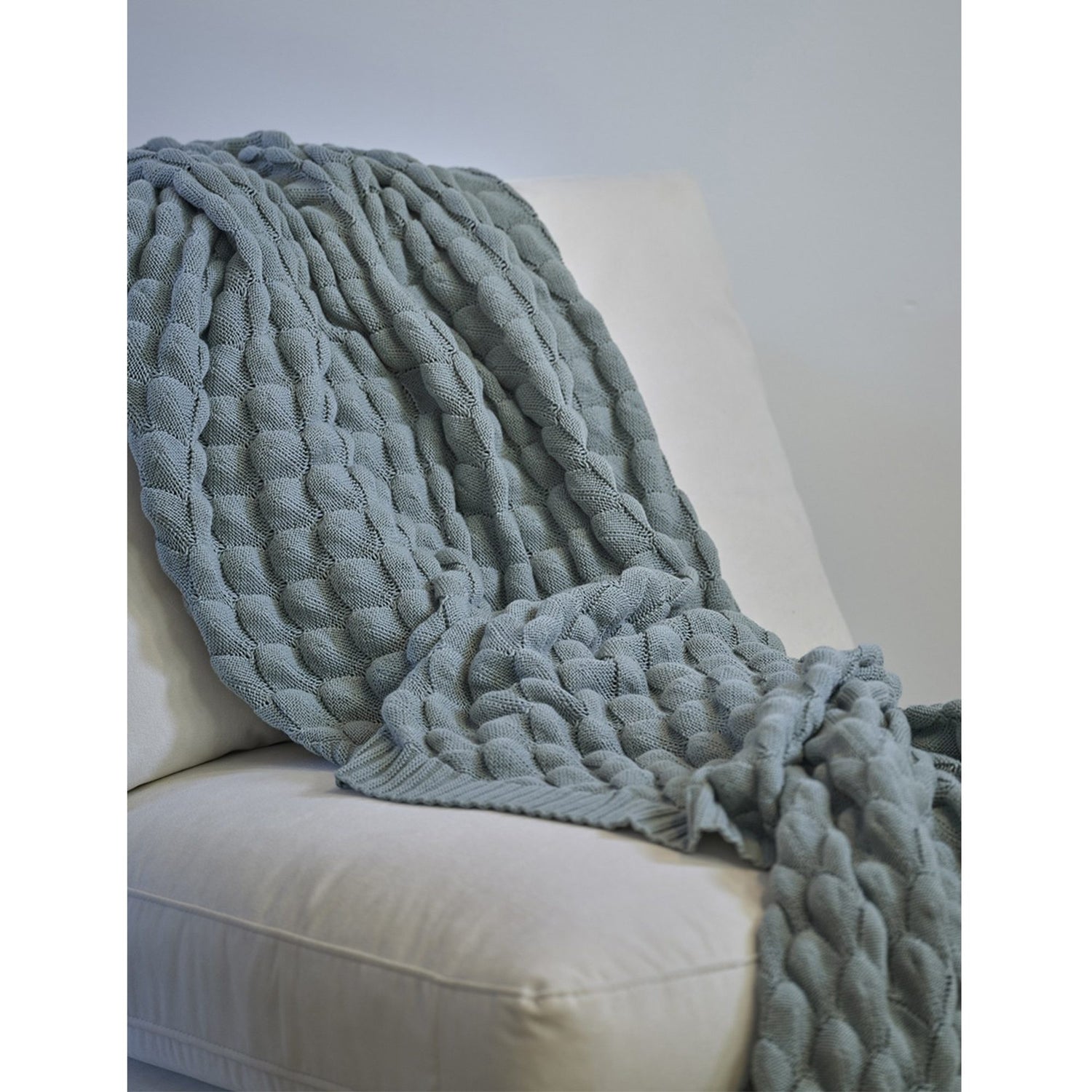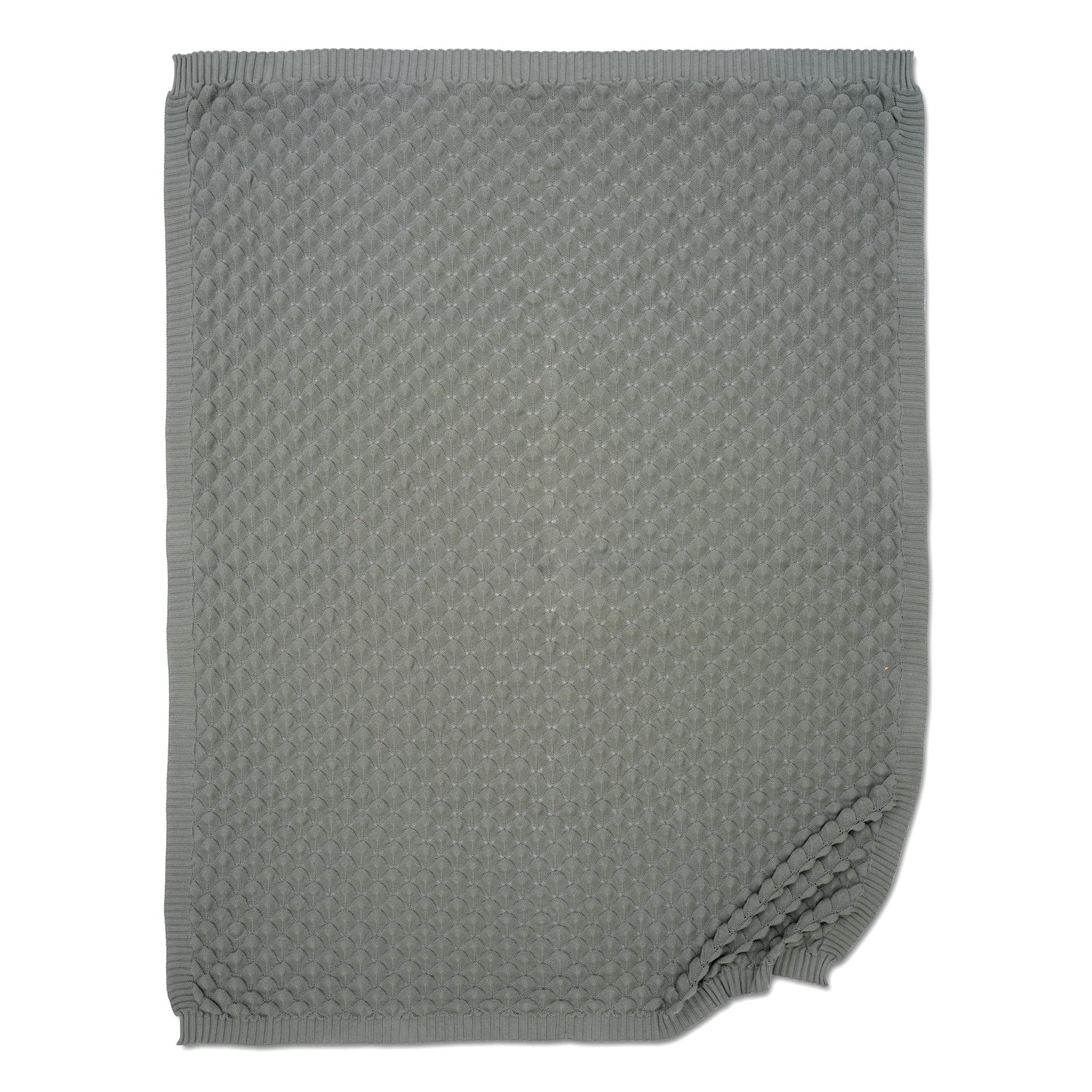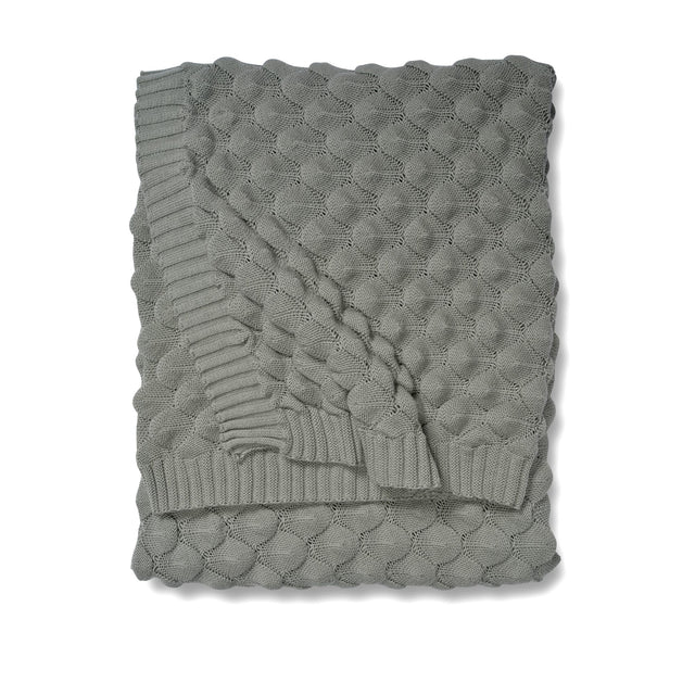Pläd Gems Slate Grey är stickad i mjuk bomull, har ett fiskfjällsmönster och en lätt melerad yta.