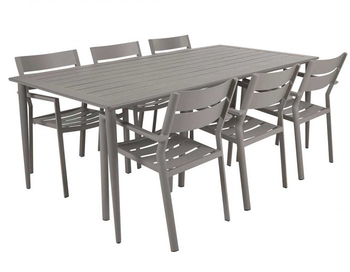 Nimes är ett elegant matbord i pulverlackad lackad aluminium från Brafab. Nimes har en elegant ribbad toppskiva med nätta och snygga konade ben. Bordet är helt underhållsfritt och kan stå ute hela sommarsäsongen. Skydda gärna under vinter.