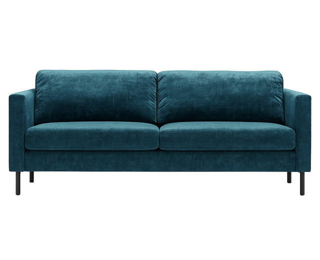 Som soffa erbjuder Felix en stabil och behaglig sittupplevelse med en konstruktion som är framtagen för daglig användning. De svarta metallbenen gör modellen modern och stilren och passar fint ihop med den blå klädseln.