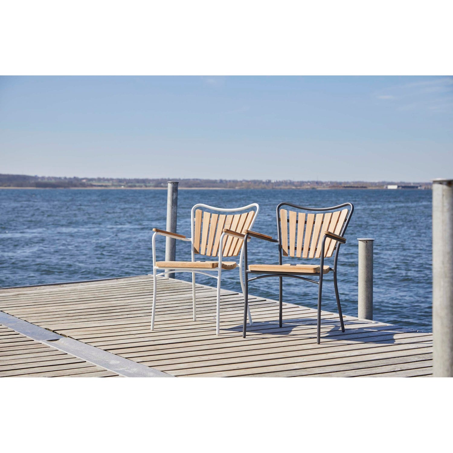 Denna Ellen karmstol kombinerar stil och funktionalitet med teakträ och pulverlackerad aluminium. Perfekt för trädgården, terrassen eller balkongen.