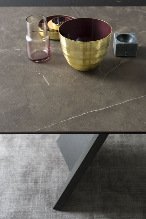 Toppskivan är tillverkad i keramik som är ett enormt slitstarkt material som inte kräver något underhåll. Benen finns i olika finishar samt att du väljer färg på metallunderredet under bordsskivan. Bordet fanns tidigare med raka hörn men tillverkas endast med rundade hörn nu. Observera att vissa av bilderna kan ha bordet med raka hörn. Kontakta kundtjänst eller butik för mer information.
