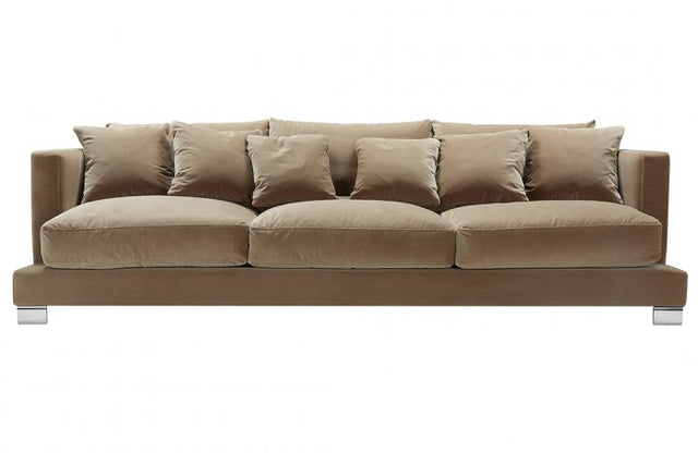 Här med det exklusiva sammetstyget Lario Blue med avtagbar klädsel och kromade metallben.