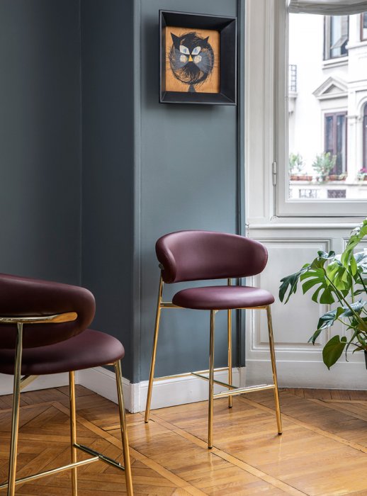 Oleandro är en exklusiv barstol från Italienska Calligaris. Den är klädd med ett slitstarkt konstläder. Oleandro har en härlig rundad rygg som tillsammans med den vadderade sittdynan ger en underbar sittkomfort. På så sätt blir det nästan som att sitta i en fåtölj men samtidigt är den nätt och smidig. De nätta metallbenen går att få i matt svartlackad metall eller varför inte en elegant polerad mässing.