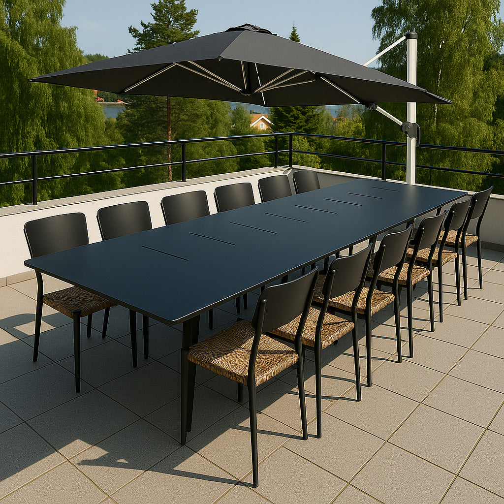 Det som verkligen sätter Vitoria isär är dess imponerande funktionalitet. Basen är designad för att rotera 360 grader, vilket ger dig möjlighet att justera skuggan efter solens position under dagen. Dessutom kan parasollet tiltas i sidled för att ytterligare förbättra skuggningen och skapa den perfekta atmosfären för avkoppling och njutning.