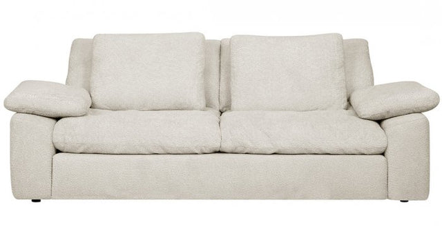 I detta utförande är Ymer 3-sits soffa klädd i Anthology Cream. Tyget är ett mjukt och följsamt boucletyg med en lätt fluffig textur som ger en otroligt mysig känsla. Det är samtidigt mycket slitstarkt och lämpar sig även för offentlig miljö.