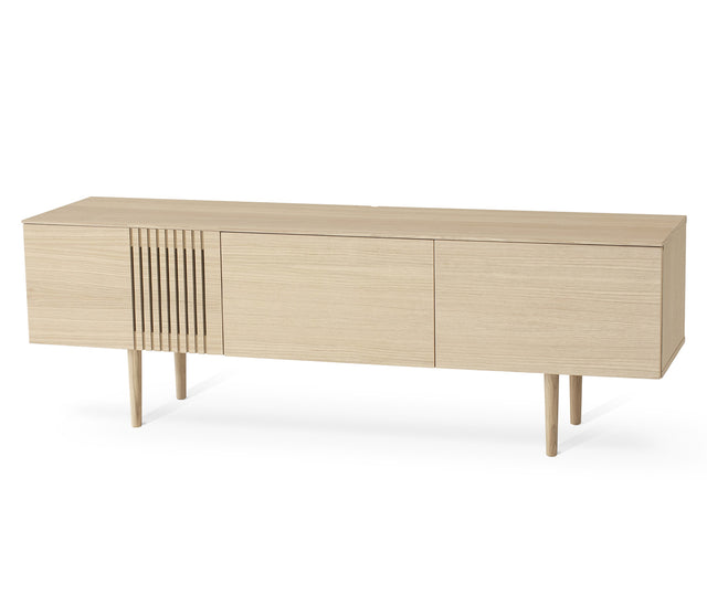 Joel är en modern serie med mediabänkar från Torkelson. Stommen är tillverka i mdf med en elegant vitoljad ekfanér på. Välj sedan vitoljad eller svartbetsad finish så den passar ditt vardagsrum. Joel har tre sektioner med push-open funktion där den längst till vänster har en ribbad del som både ger mediabänken sin unika design samt ventilerar eventuell värme.