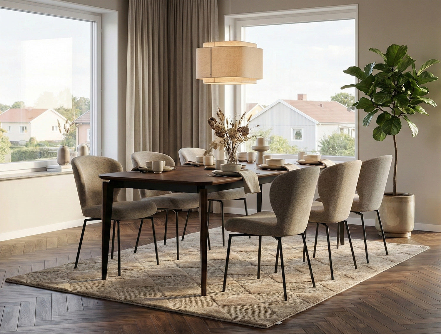 - Klädsel: i bouclétyg, ett bekvämt material känt för sin unika, öglade struktur och rika, taktila känsla.