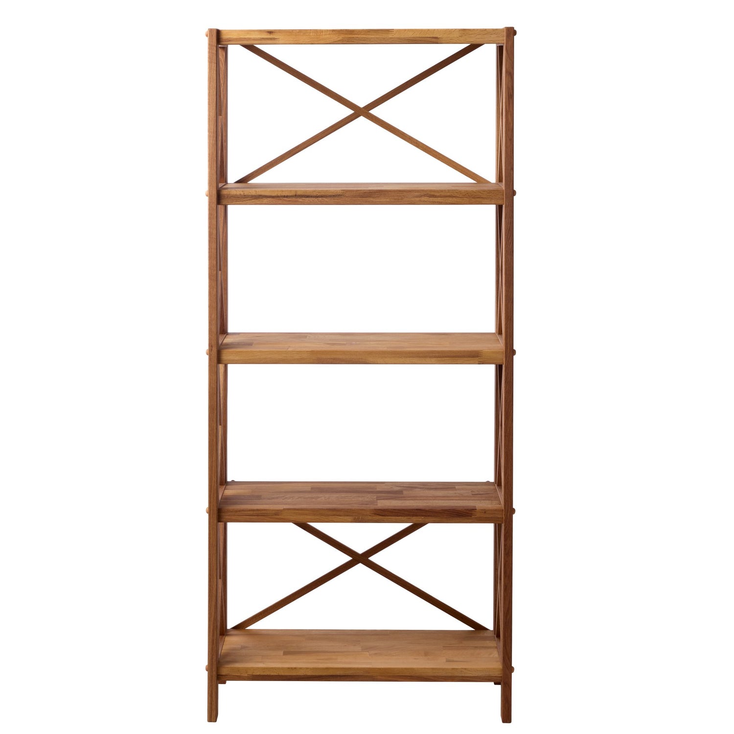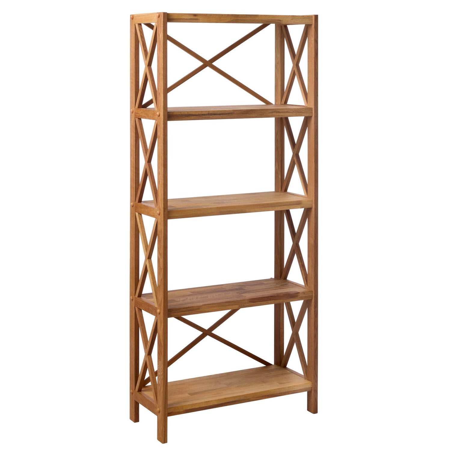 Denna hylla har en naturlig träram med fem öppna hyllor för förvaring eller visning. Sid- och bakstängerna ger extra stabilitet och en klassisk touch till designen.