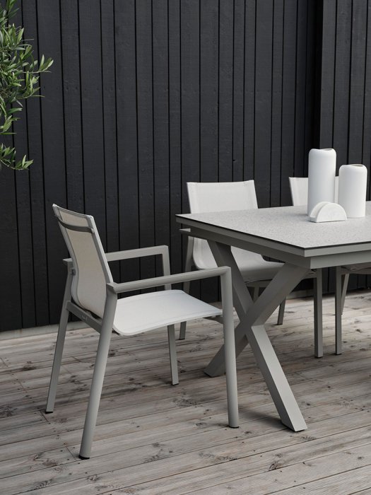 Stommen på Hillmond bordet finns i två färger där du kan välja mellan matchande färg i aluminium som topp eller högtryckslaminat som finns i två färger. Hillmond kommer i två storlekar. Undertill sitter ett stilrent kryssunderrede som är infällt vilket gör att du kan sitta hela vägen. Hillmond är tillverkad helt i aluminium och är därför helt underhållsfri och klarar av väder och vind helt utmärkt.