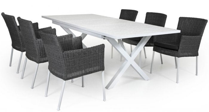 Stommen på Hillmond bordet finns i två färger där du kan välja mellan matchande färg i aluminium som topp eller högtryckslaminat som finns i två färger. Hillmond kommer i två storlekar. Undertill sitter ett stilrent kryssunderrede som är infällt vilket gör att du kan sitta hela vägen. Hillmond är tillverkad helt i aluminium och är därför helt underhållsfri och klarar av väder och vind helt utmärkt.