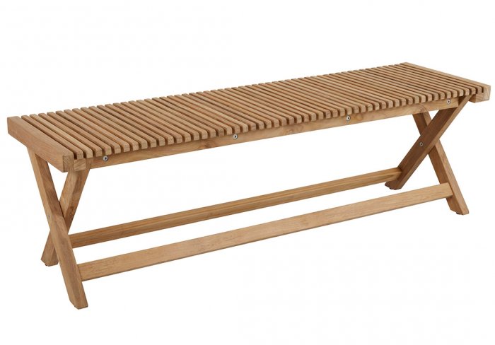 En bänk i två storlekar och med många möjligheter – på gaveln vid bordet när sommargästerna blir många, utanför dörren eller på den vackraste platsen i trädgården. Denna bänk i elegant ribbad teak smälter in var den än ställs, och bjuder in till en paus för en eller flera personer.