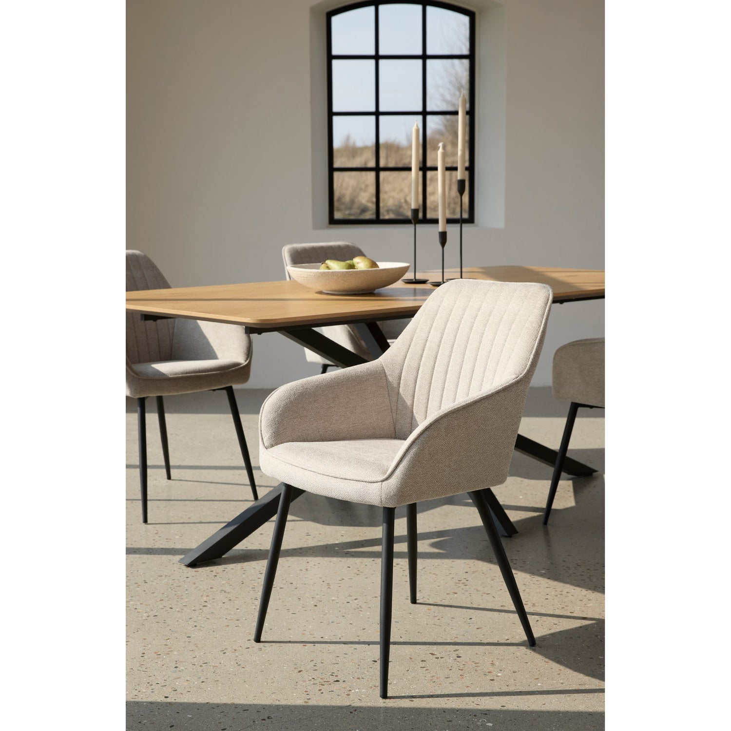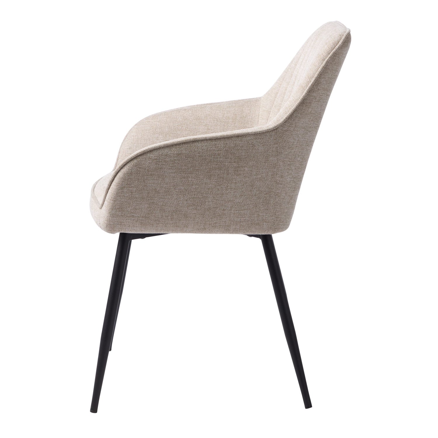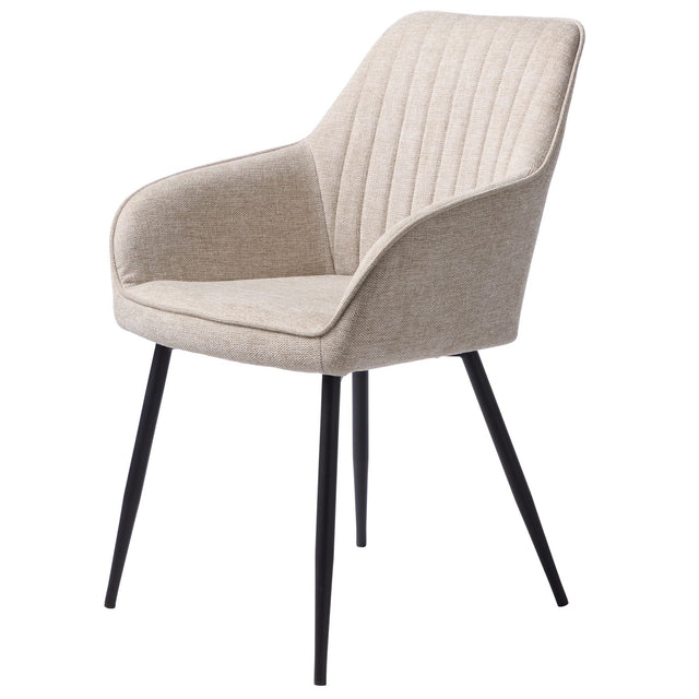 Cubo Randig i sand mjukar upp rummet med en ljus, varm ton,  perfekt när du vill ha ett inbjudande uttryck utan att kompromissa med stil. Den välstoppade sitsen och den rundat omslutande ryggen ger skönt stöd genom hela kvällen, medan den diskreta, vertikala randsömnaden tillför struktur och elegans. De smäckra benen i svart metall skapar en snygg kontrast som gör helheten modern och lättplacerad.