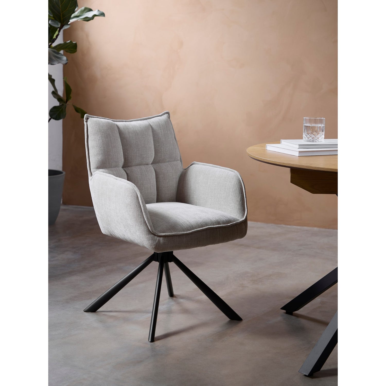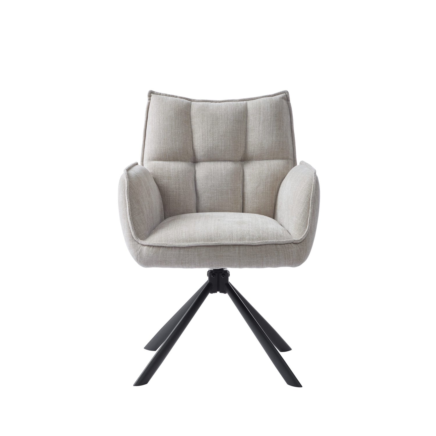 Denna stol har svarta metallben med en svängfunktion som kombinerar praktiskhet med skandinavisk stil. Det klädda utförandet säkerställer komfort och gör den till ett perfekt tillskott i hemmet.
