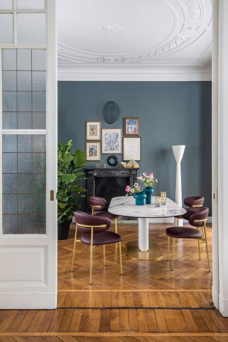 Tillverkad av lackad metall stödjer den centrala pelaren den eleganta toppskivan som med en raffinerad blandningen av metall och keramik med en marmoreffekt skapar en lekfull kontrast mellan kalla och varma material.