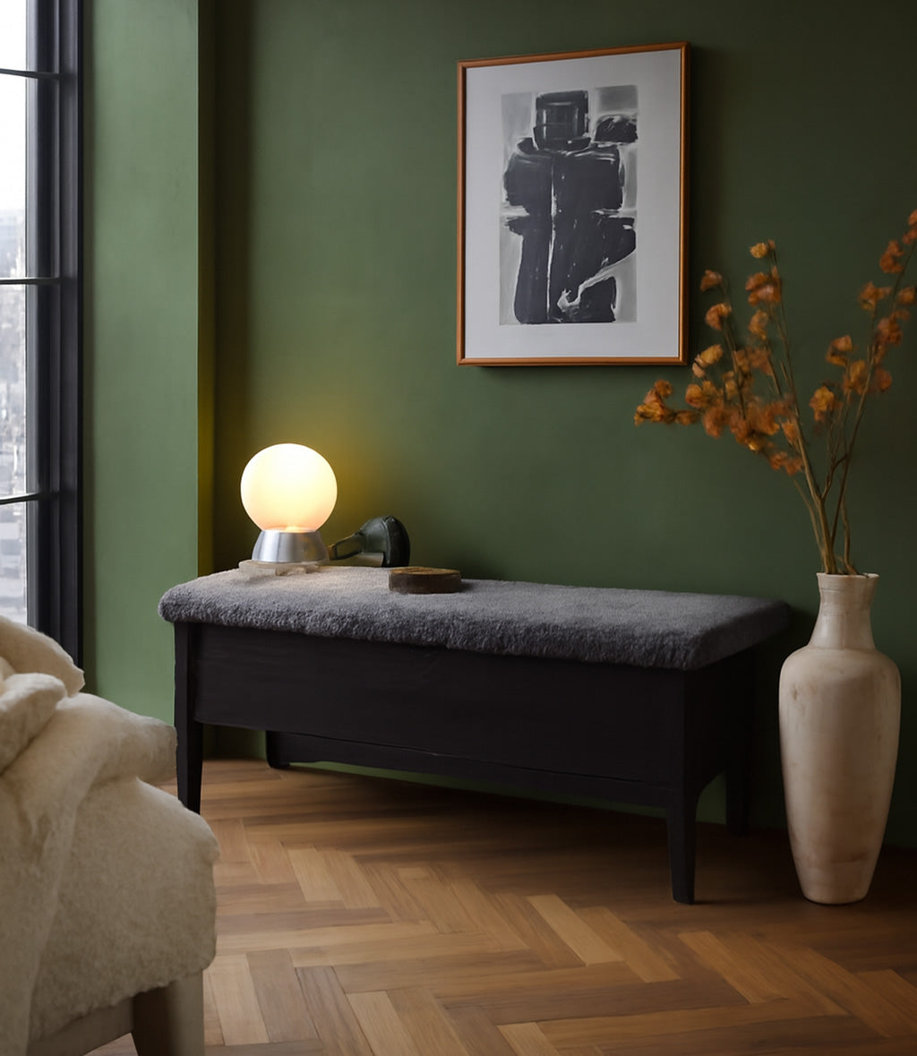 Men Klinte är mer än bara en vacker möbel. Den är också praktisk och flexibel. Välj mellan olika klädslar på toppen – grått ulltyg, grå fårskinnsimitation, äkta fårskinn eller det ljusgråa tyget Chelsea – för att skapa din perfekta kombination. På insidan av bänken finns ett rymligt fack med en praktisk skiljevägg, som är perfekt för att organisera dina saker. Skiljeväggen går att tas bort för att göra plats för större föremål.