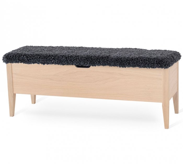 Men Klinte är mer än bara en vacker möbel. Den är också praktisk och flexibel. Välj mellan olika klädslar på toppen – grått ulltyg, grå fårskinnsimitation, äkta fårskinn eller det ljusgråa tyget Chelsea – för att skapa din perfekta kombination. På insidan av bänken finns ett rymligt fack med en praktisk skiljevägg, som är perfekt för att organisera dina saker. Skiljeväggen går att tas bort för att göra plats för större föremål.