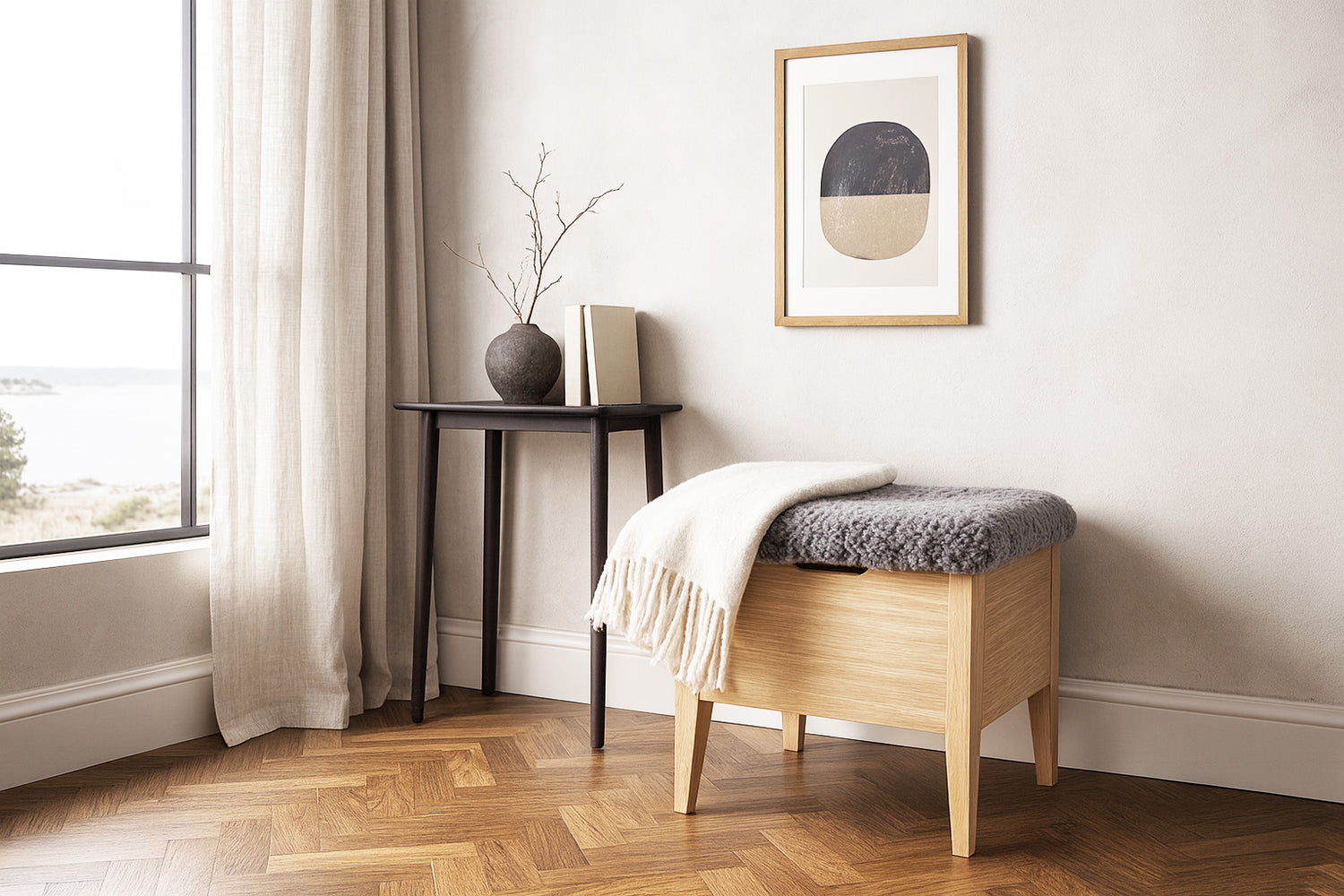 Men Klinte är mer än bara en vacker möbel. Den är också praktisk och flexibel. Välj mellan olika klädslar på toppen – grått ulltyg, grå fårskinnsimitation, äkta fårskinn eller det ljusgråa tyget Chelsea – för att skapa din perfekta kombination. På insidan av bänken finns ett fack med praktiska förvaring.