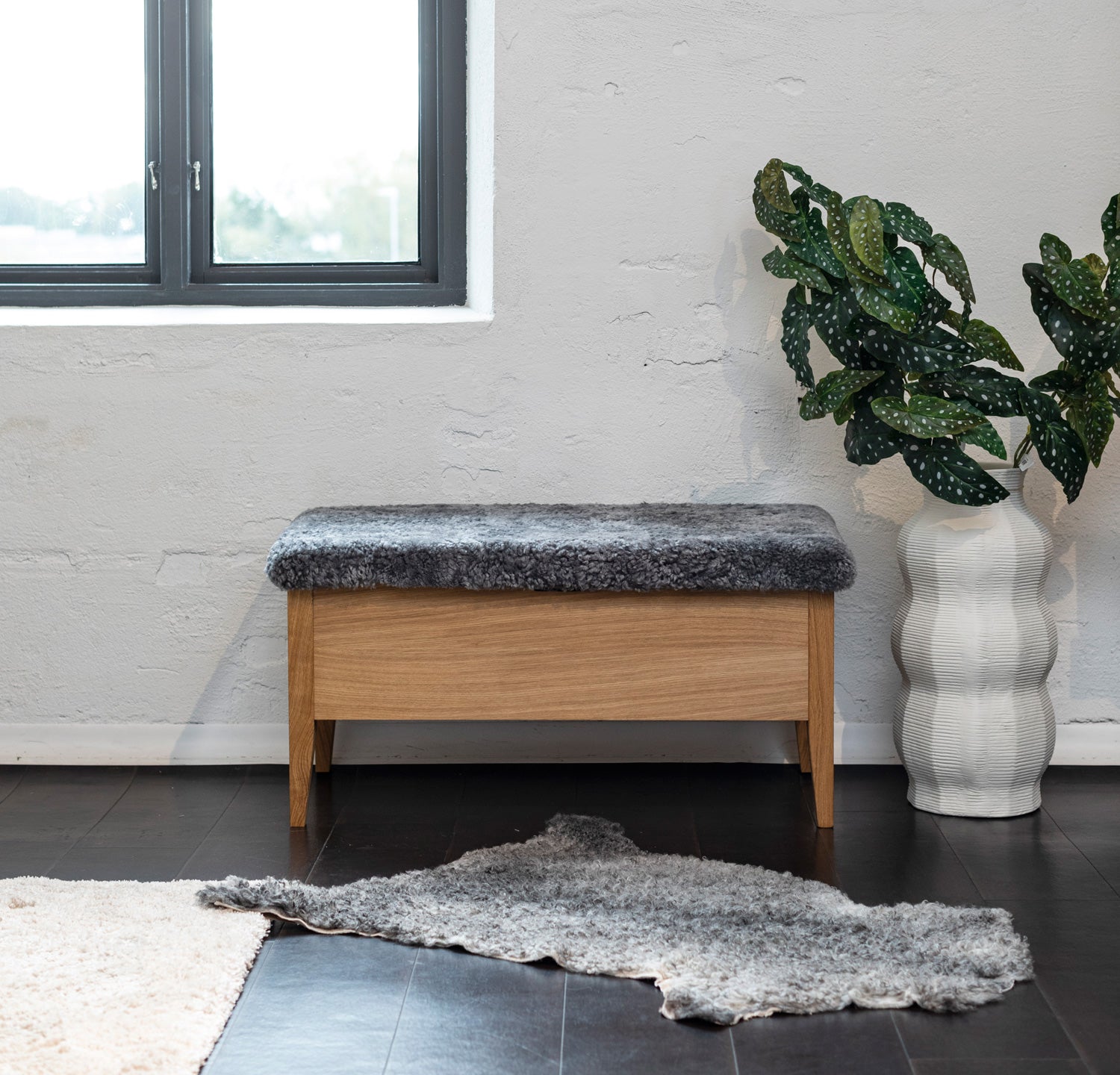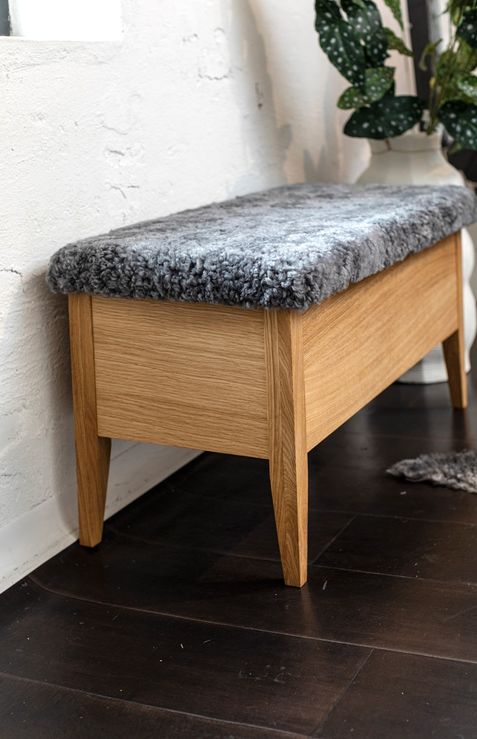 Men Klinte är mer än bara en vacker möbel. Den är också praktisk och flexibel. Välj mellan olika klädslar på toppen – grått ulltyg, grå fårskinnsimitation, äkta fårskinn eller det ljusgråa tyget Chelsea – för att skapa din perfekta kombination. På insidan av bänken finns ett rymligt fack med en praktisk skiljevägg, som är perfekt för att organisera dina saker. Skiljeväggen går att tas bort för att göra plats för större föremål.