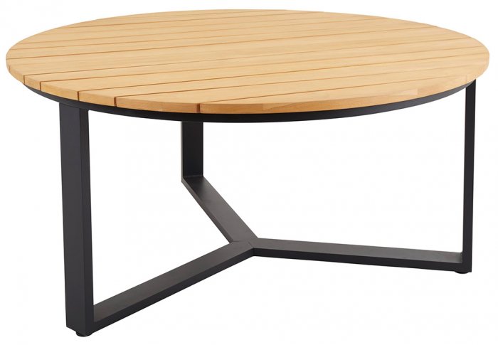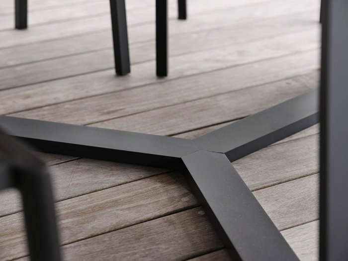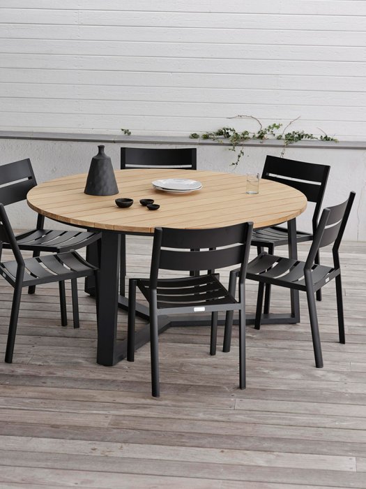 Benstativet på Laurion matbord finns i svartlackerad aluminium eller trä, beroende på modell, och ger ett elegant kontrast till den vackra teakdesignen. Bordstoppen, präglad av unik design och skickligt hantverk, är tillverkad av teak och ger en naturlig och varm känsla till möbeln.