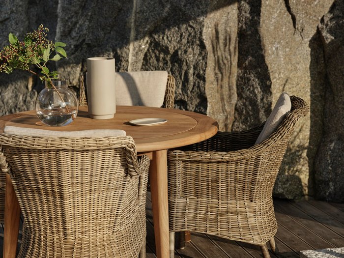 Lilja är en grupp gjord för att passa både till avkoppling och måltider. Runda organiska former i teak. Rejäla delar som samtidigt har en elegans i sina rundade detaljer.