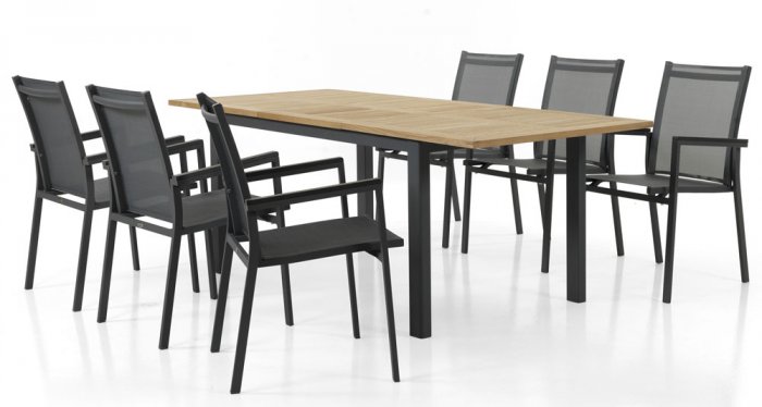 I detta set ingår ett Lyon Bord 152-210cm Teak/svart med 6st Avanti stapelstolar i matt svart finish.