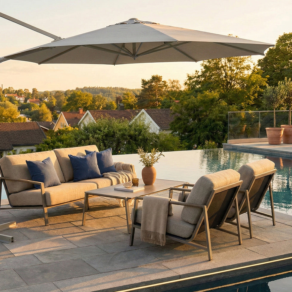 Lyra är en modern loungegrupp med djupa utesoffor och fåtöljer med perfekt lutning för optimal komfort. De tjocka sandfärgade dynorna är fyllda med högdensitetsskum och klädda i vattenavvisande olefintyg med liner. Den pulverlackerade ramen är i rostfritt stål med snygga detaljer i konstrotting.