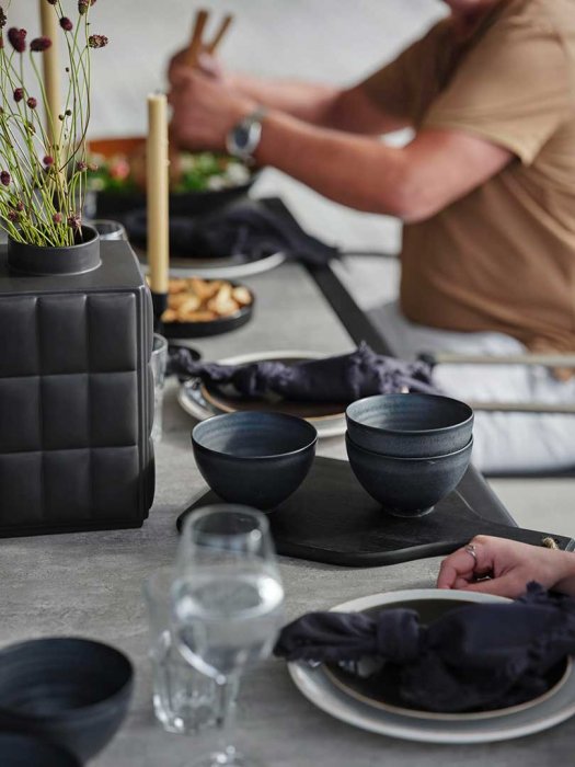 Lyra är en modern och mycket sober matgrupp i en härlig blandning av material. Matbordet har en toppskiva i 3D-printat glas med härlig struktur tack vara det gråa betongmönstret. Snygga detaljer som att skivan fortsätter ut över kanterna på kortsidorna. Stommen består av matt svart pulverlackerat rostfritt stål. Vackert och lättskött. Se samtliga produkter i Lyra-kollektionen här!