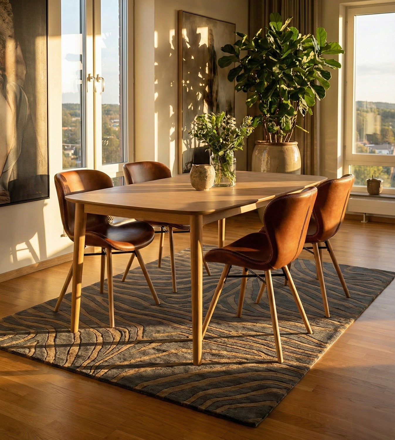 - Bordsskivan i lackerad ekfaner ger en varm atmosfär.