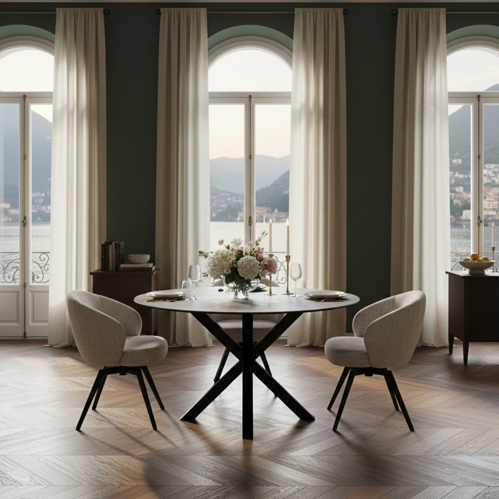 Den skulpturala korsbasen i svart pulverlackerat stål ger bordet både stabilitet och ett distinkt formspråk. Bordet rymmer bekvämt upp till fyra personer och passar lika bra för vardagsmiddagar som för festliga tillfällen. Upptäck hela Verdun-serien här!