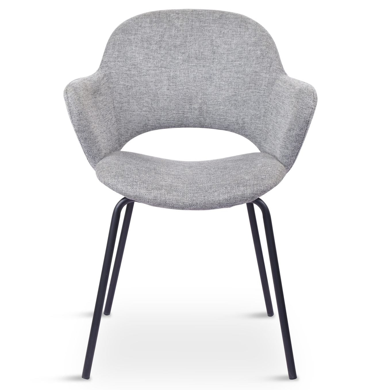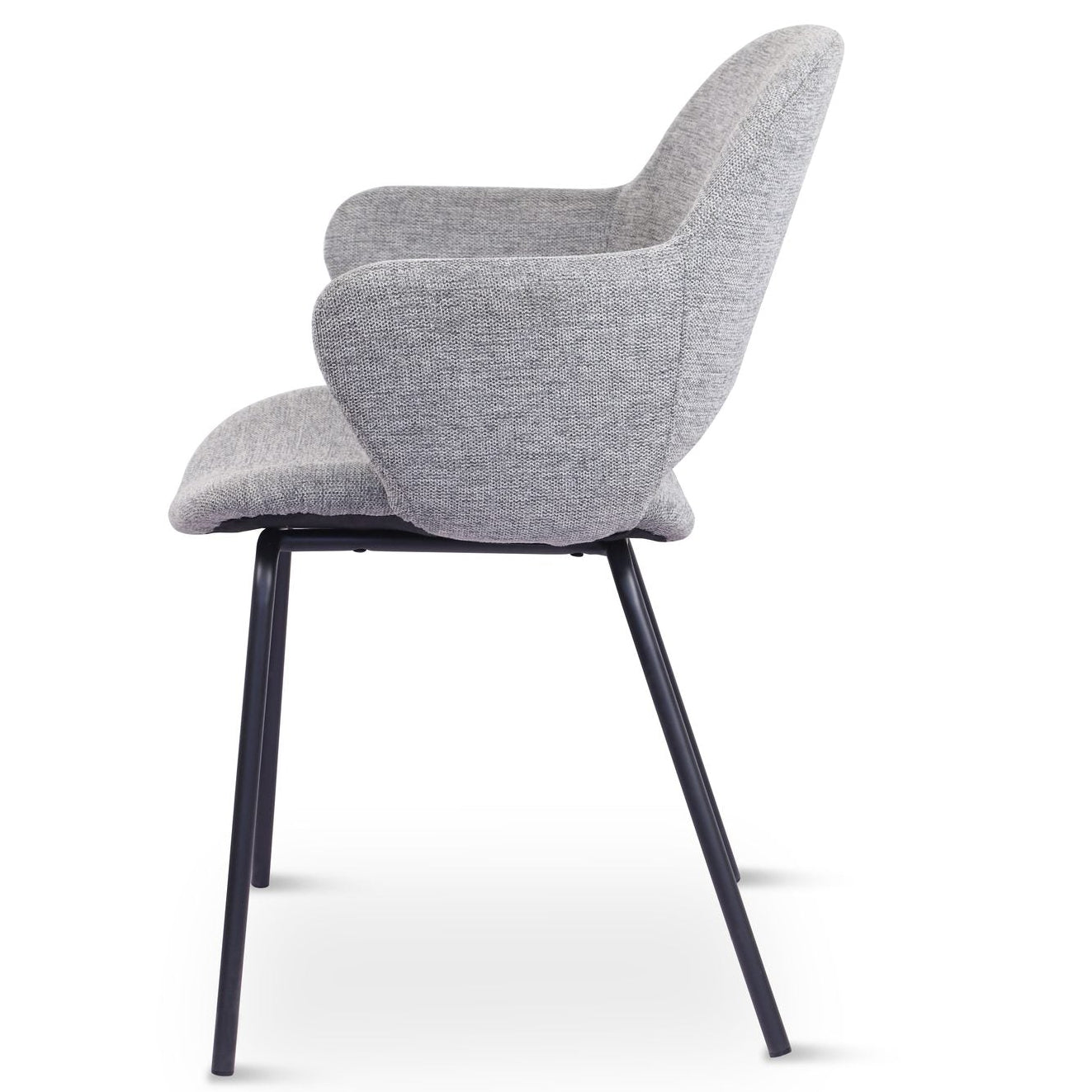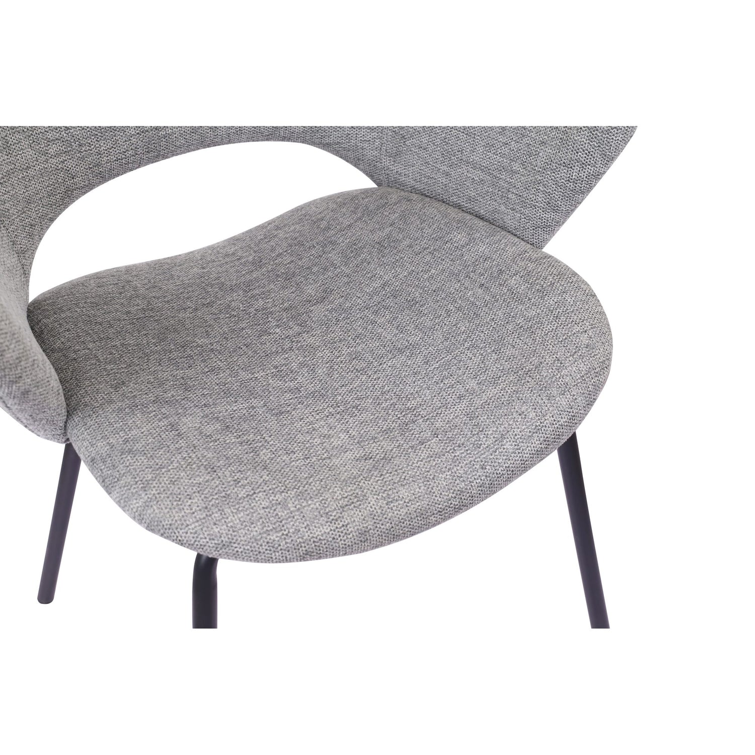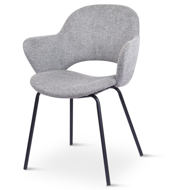 Mare i grått kombinerar mjuk komfort med ren, skandinavisk form. Den klädda sitsen och den mjukt rundade ryggen med öppning i svanken ger skön avlastning och en luftig look runt bordet. Slanka, svartlackade metallben ramar in siluetten och gör stolen stabil utan att ta plats, lätt att matcha i både kök och matrum.