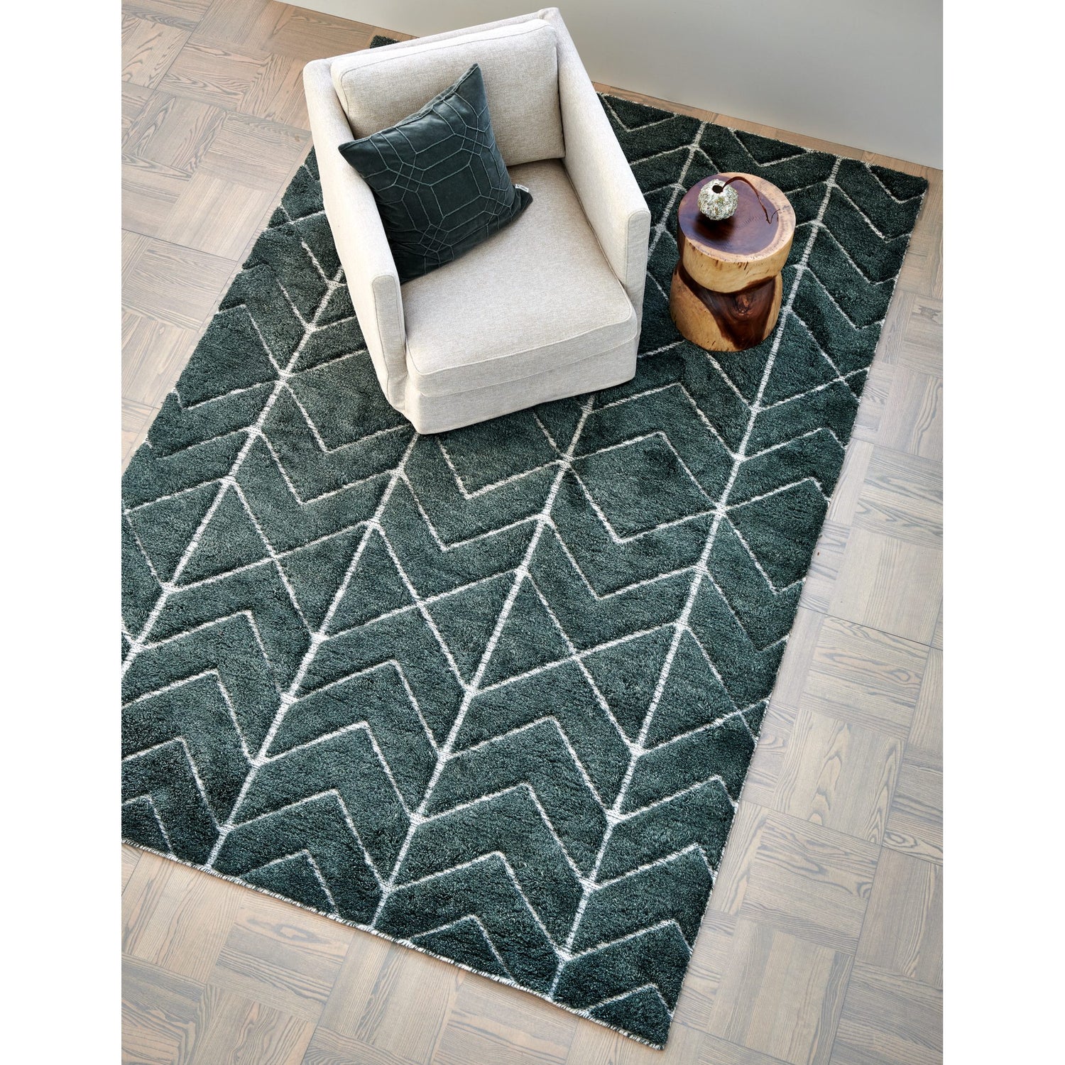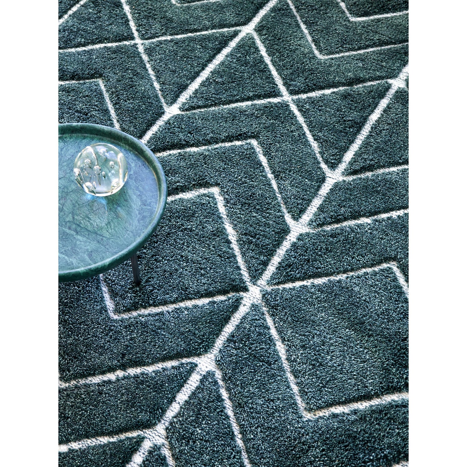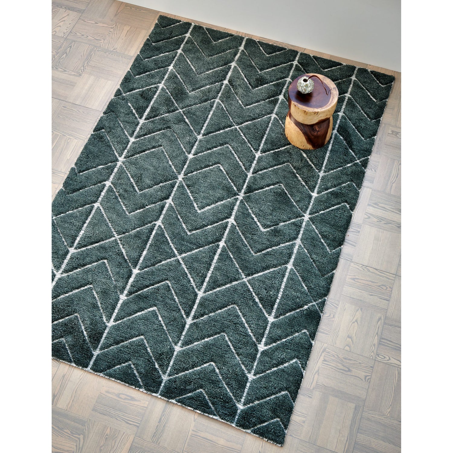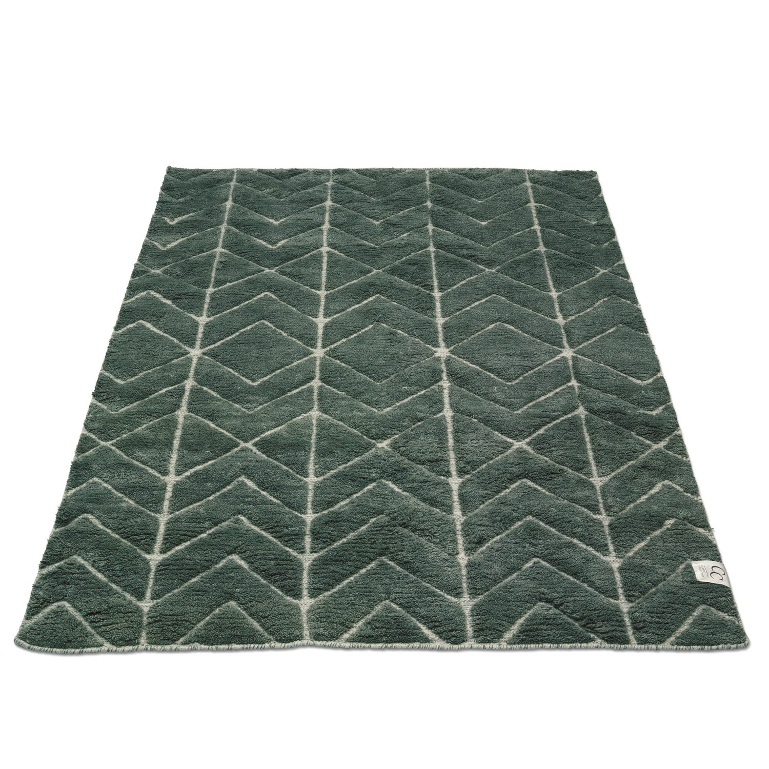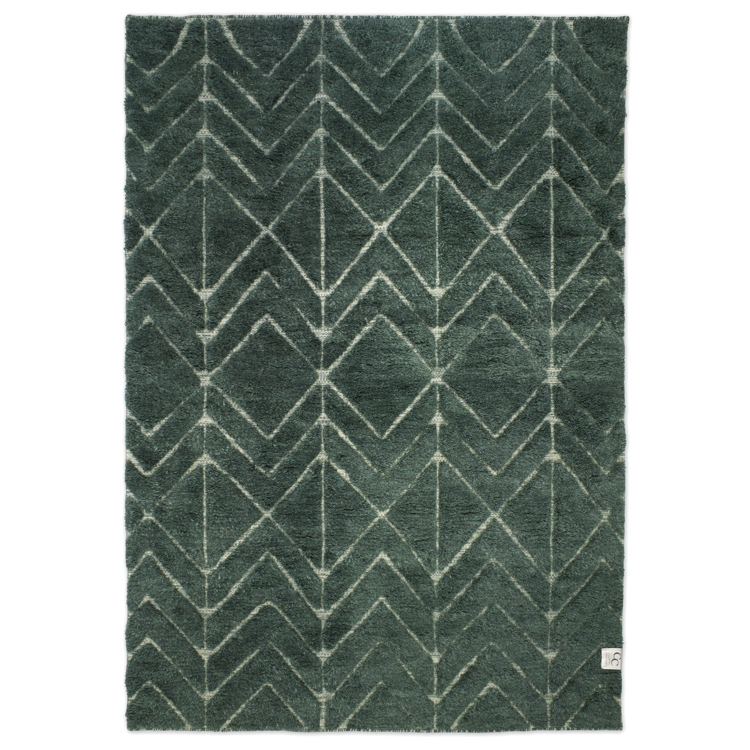 Fluffig grön luggmatta med mönster i högt och lågt.