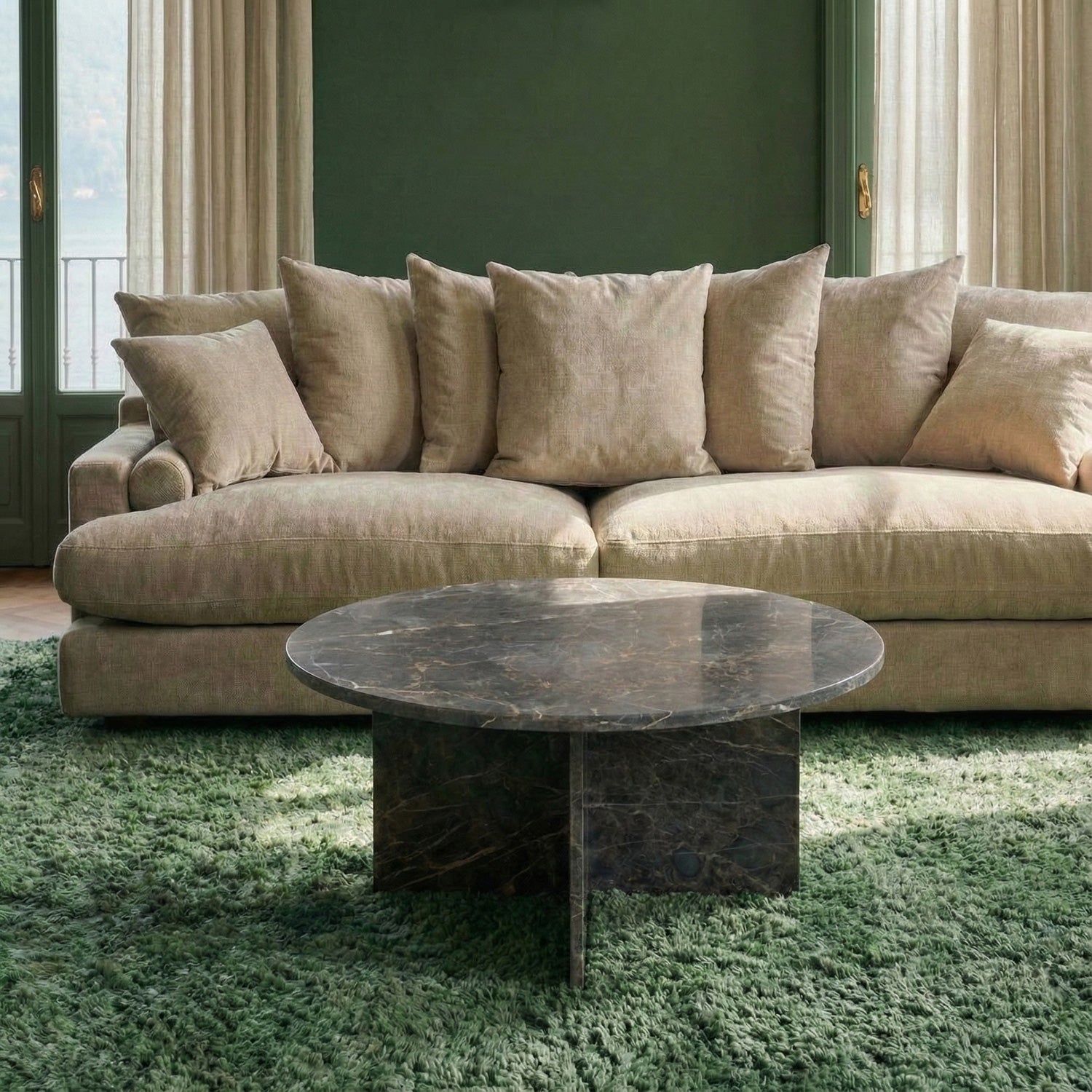 Bjud in en känsla av tidlös elegans i vardagsrummet med soffbordet Miramas. Den runda bordsskivan vilar på en bas bestående av två V-formade konstruktioner som skapar en harmonisk balans och ger rummet en naturlig mittpunkt. Bordet är tillverkat i brun marmor, ett levande naturmaterial som varierar i färg, struktur och yta – vilket gör varje bord helt unikt.