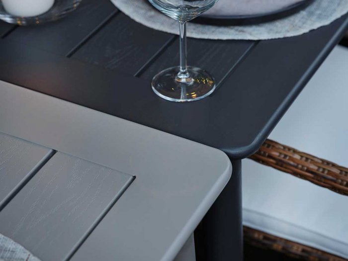 Nimes är ett elegant matbord i antracitgrå pulverlackad aluminium från Brafab. Nimes har en elegant ribbad toppskiva med nätta och snygga konade ben. Bordet är helt underhållsfritt och kan stå ute hela sommarsäsongen. Skydda gärna under vinter.