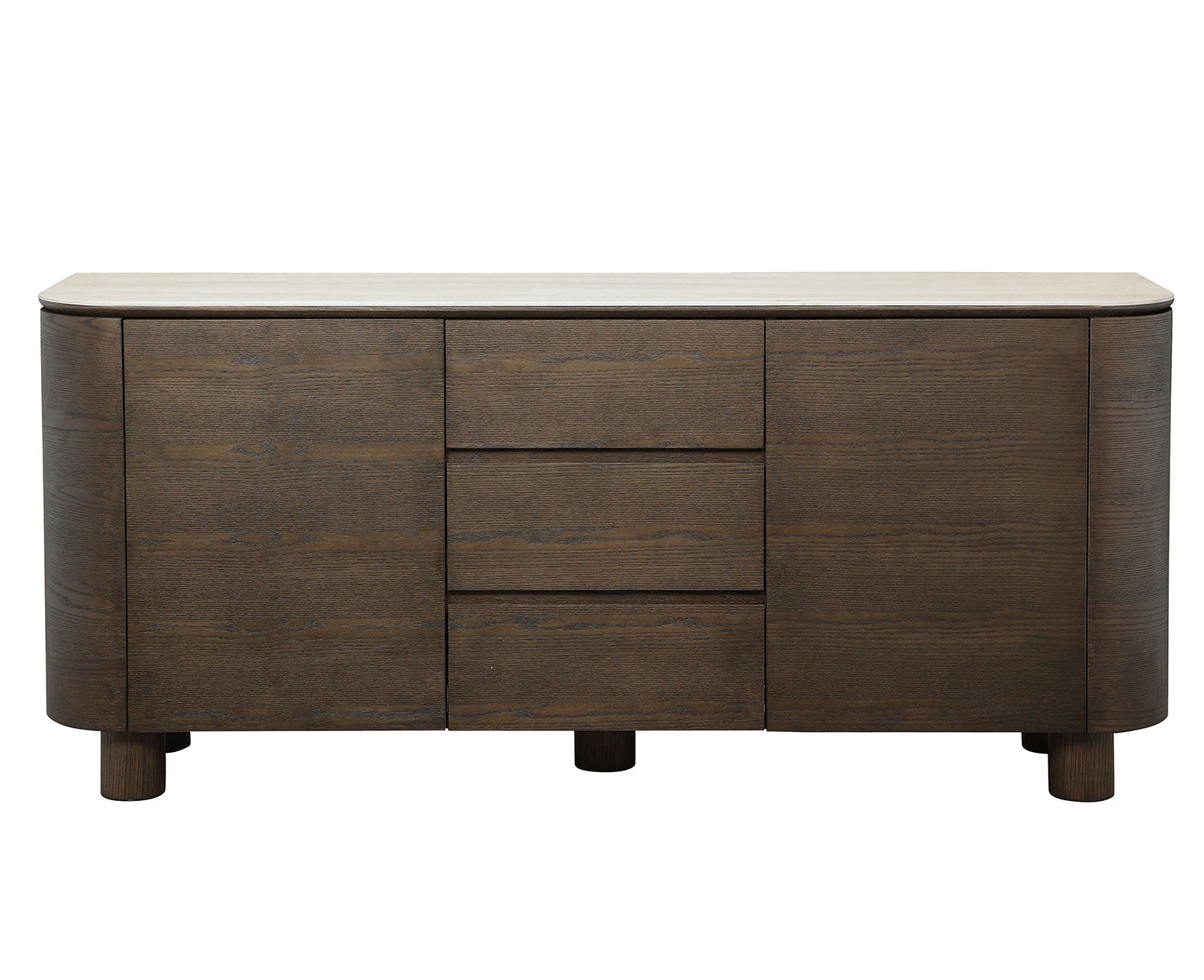 Med generösa skåp och lådor erbjuder sideboardet gott om plats för porslin, glas och vardagsföremål. Den stilrena fronten med mjukt rundade former gör att möbeln passar lika bra i matsal som i vardagsrum.
