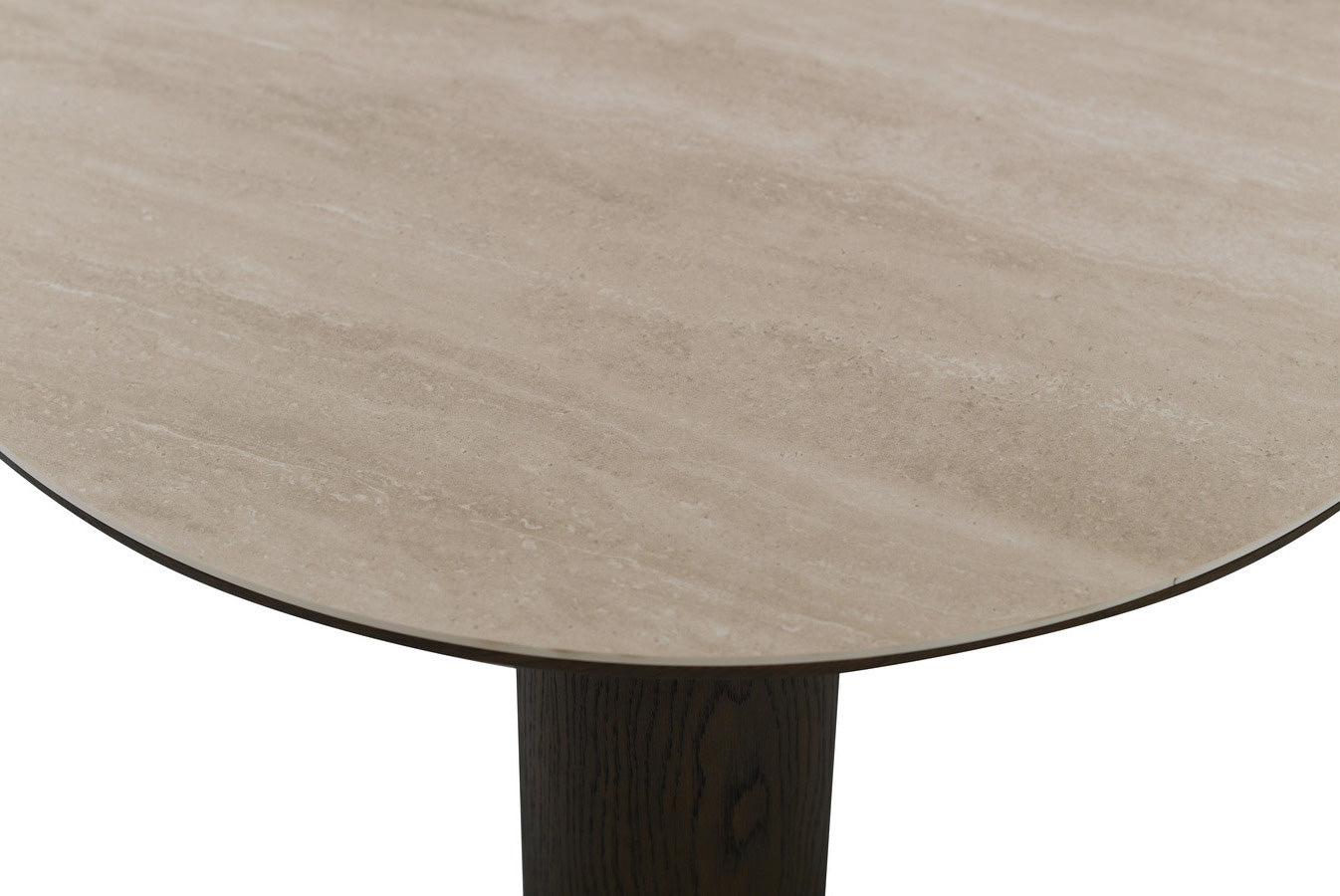 Den robusta stommen i brunbetsad ek ger bordet en varm och naturlig karaktär, medan den keramiska travertin-toppen skapar en sofistikerad kontrast och en slitstark yta som håller sig vacker över tid.