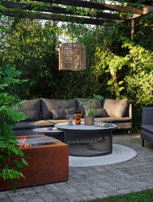 Modern, bekväm och byggbar. Callisto är sittmöbeln som ger ett extra djup till uteplatsen. Här har måtten nämligen fått bre ut sig lite extra – och det märks i verkligen i komforten. Djupa och breda på ett sätt som förlänger hemmet långt ut. Samtliga delar är snyggt grå i vattenavvisande olefintyg som även försetts med liner som gör att vatten inte tränger in i dynan. Ben i svart aluminium.