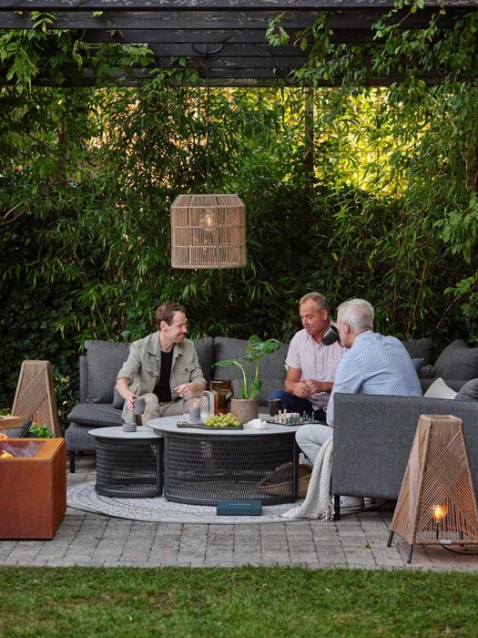 Modern, bekväm och byggbar. Callisto är sittmöbeln som ger ett extra djup till uteplatsen. Här har måtten nämligen fått bre ut sig lite extra – och det märks i verkligen i komforten. Djupa och breda på ett sätt som förlänger hemmet långt ut. Samtliga delar är snyggt grå i vattenavvisande olefintyg som även försetts med liner som gör att vatten inte tränger in i dynan. Ben i svart aluminium.