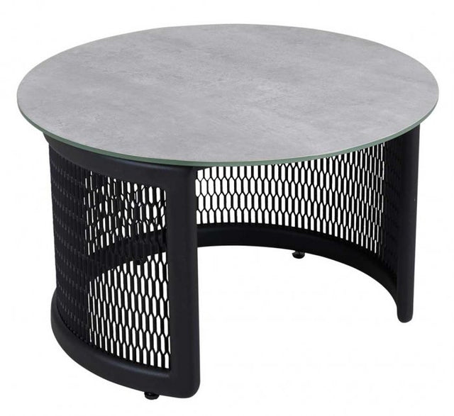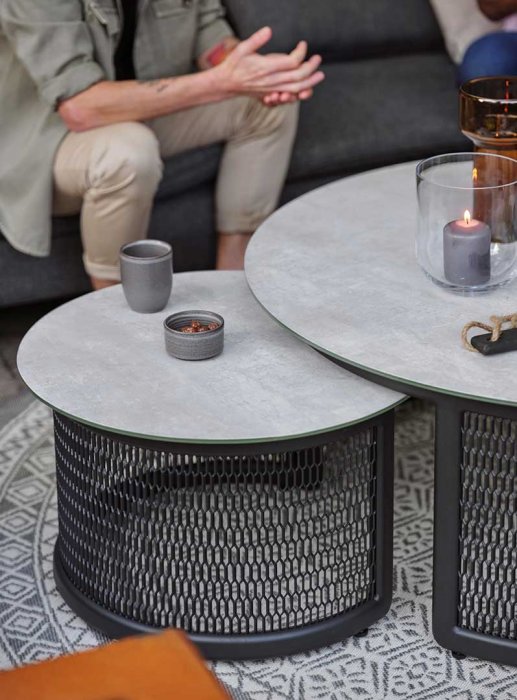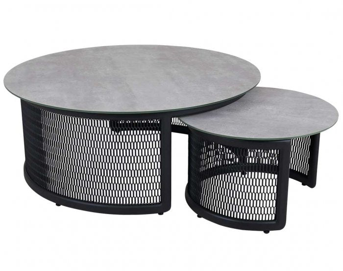 Soffbordets underrede kommer i perforerad mattsvart aluminium i två olika höjder och storlekar. Bordsskivan har läcker betonglook och är gjord i printat glas. Kan användas separat eller i kombination, det lilla bordet kan då skjutas in under det större för att skapa spännande nivåskillnader.