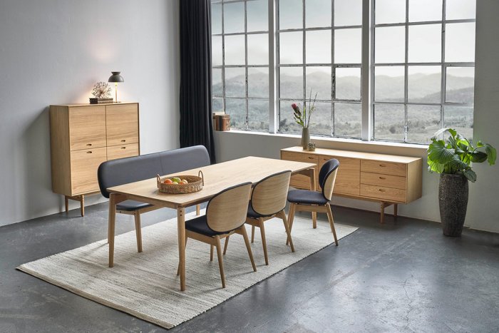 Stomme i ljus ek, svart ek, rökfärgad ek eller valnöt. Välj mellan olika tyger som klädsel eller varför inte tidlös och praktiskt läder. Kombinera så det passar just din matgrupp. Artus är tillverkad av det danska designmärket PBJ Designhouse.