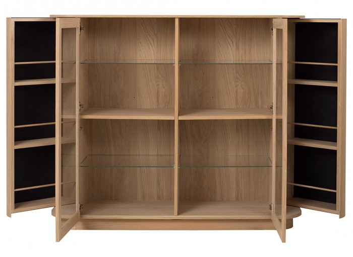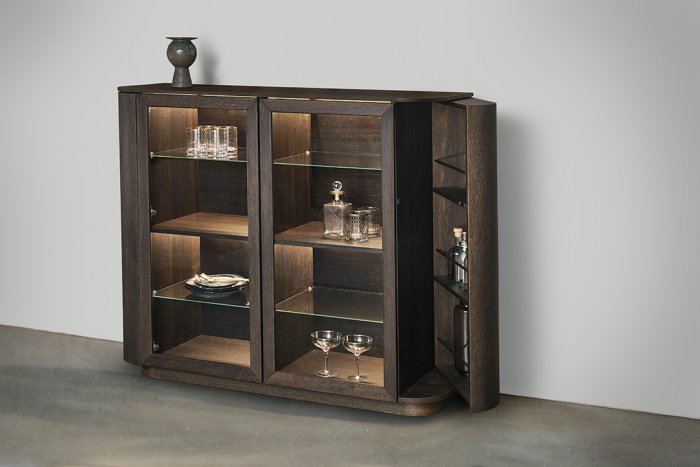 En av de unika egenskaperna hos Collum-möblerna är det praktiska dryckes- och förvaringsfacket på båda sidor av skåpen. Med böjda trädörrar, försedda med magnetspärr, har du en enkel åtkomst till allt du behöver för att göra ditt hem organiserat och snyggt.
