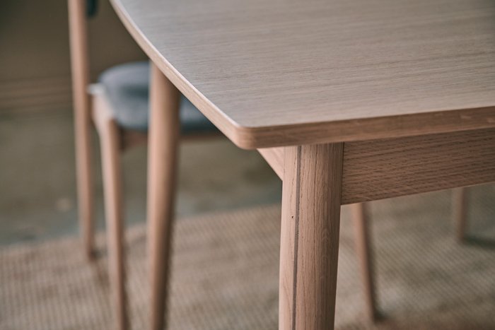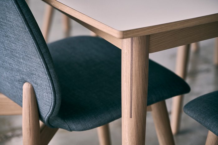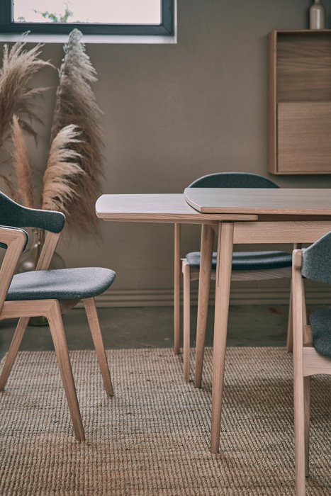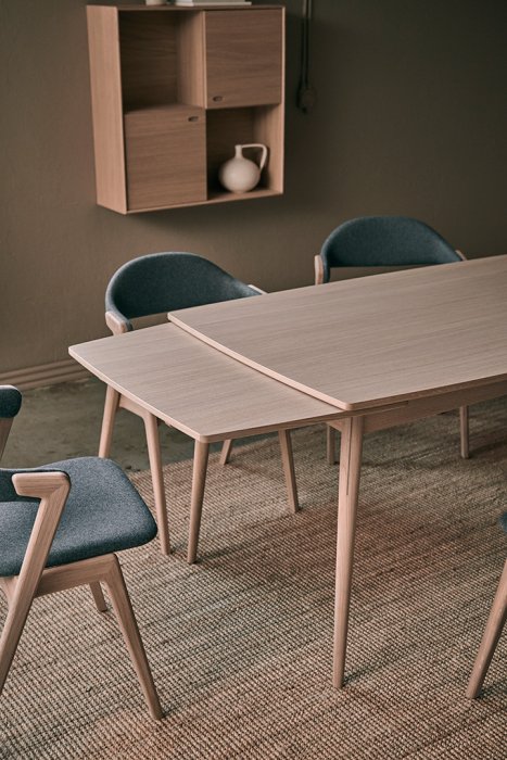 Navis matbord är designat av Morten Svendsen och har ett fint klassiskt utseende med en båtformad skiva och två separat integrerade förlängningsskivor som enkelt förlänger bordsskivan i varje ände. Bordet har en massiv träkant och massiva runda, konade träben.