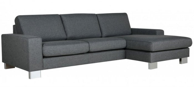 Quattro är en handtillverkad modulsoffa från Sits. Här som klassisk 3-sits soffa med divan. Stommen är gjord i plywood/massivt trä och sittkuddarna innehåller kallskum. Quattro är den perfekta soffan för dig som har speciella mått att ta hänsyn till då den är mycket flexibel eftersom att den har så många moduler att bygga med. Bredden på soffan varierar lite efter vilket armstöd du väljer. Olika ben finns som val. Du kan välja mellan standard- och luxkomfort på kuddarna. Standard har bara kallskum medans lux har kallskum med en inkapslad duntopp uppepå för att ge en mjuk och härlig komfort.