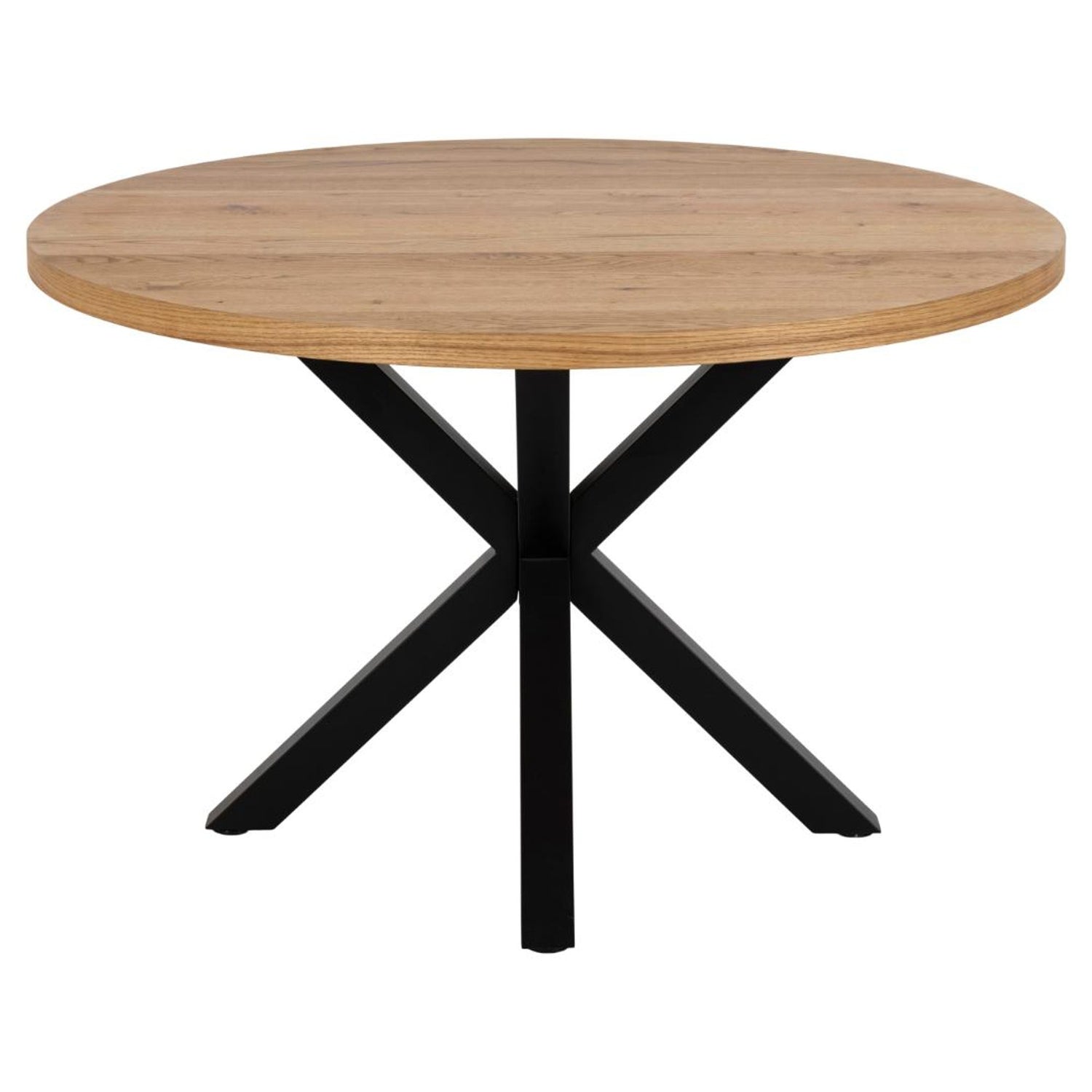 Verdun matbord förenar naturlig värme med modern design och blir en elegant mittpunkt i matsalen. Den runda bordsskivan i oljad vild ekfanér skapar en inbjudande känsla, medan den svarta korsbasen i pulverlackerad metall ger ett distinkt och samtida uttryck.