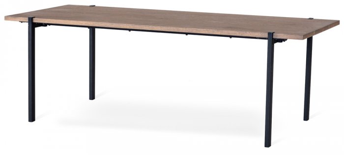 Aki är ett modernt matbord från Torkelson med en snygg design. Toppen till Aki är tillverkad i massiv gråbetsad ek som sedan fått ett tunt lager lack för enklare skötsel. Det eleganta underredet kommer i matt svartlackad metall. Du kan köpa till en upp till 2st insticksklaffar som bygger 50cm/skiva.