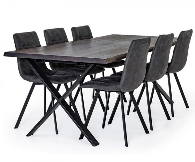 Den organiska formen på Exxet gör att det passar lika bra med klassiska trästolar som med moderna modeller i metall och tyg eller läder. I detta set ingår Exxet matbord i smoked ek, tillsammans med sex Ruth stolar i mörkgrå, en kombination som skapar en stilren och tidlös matplats.