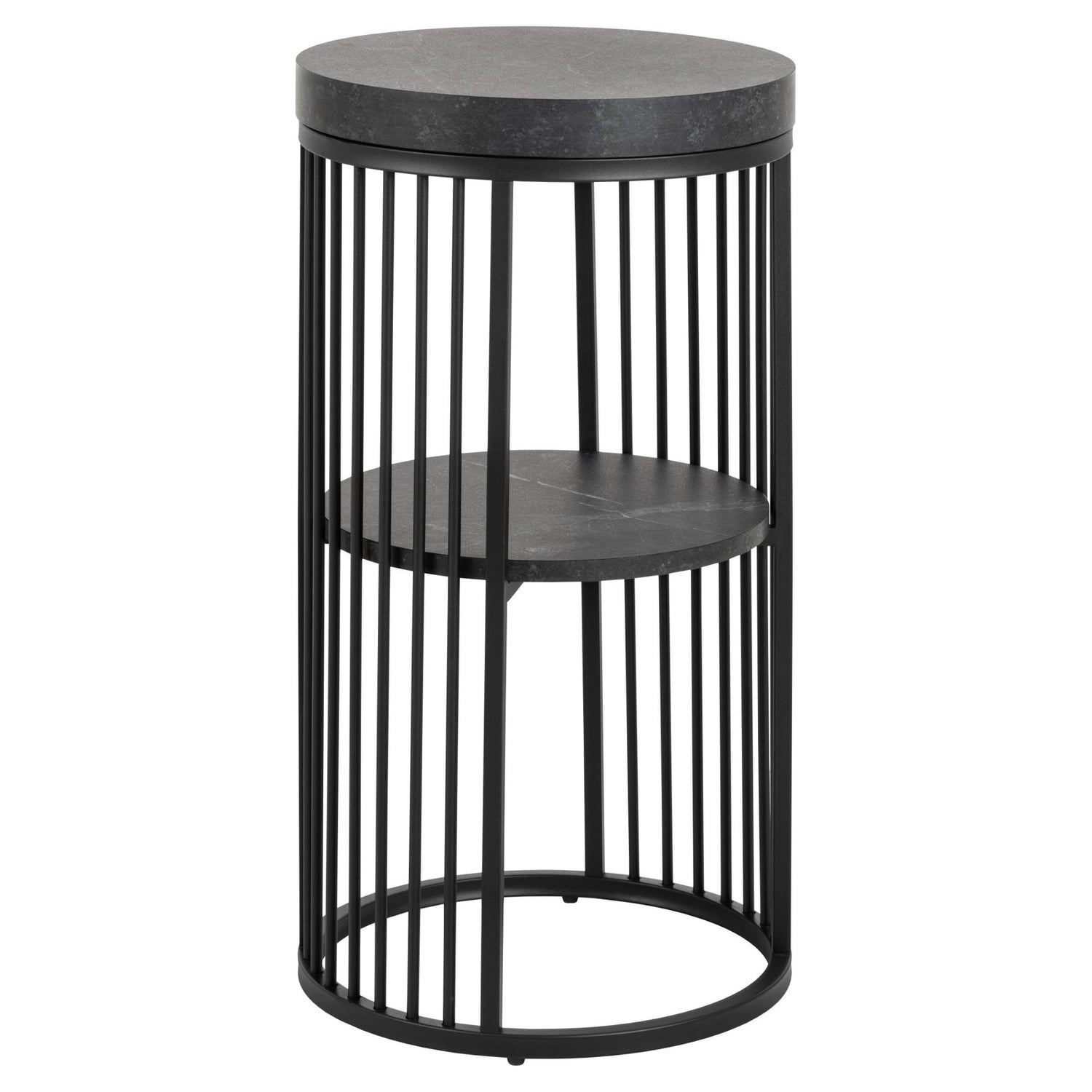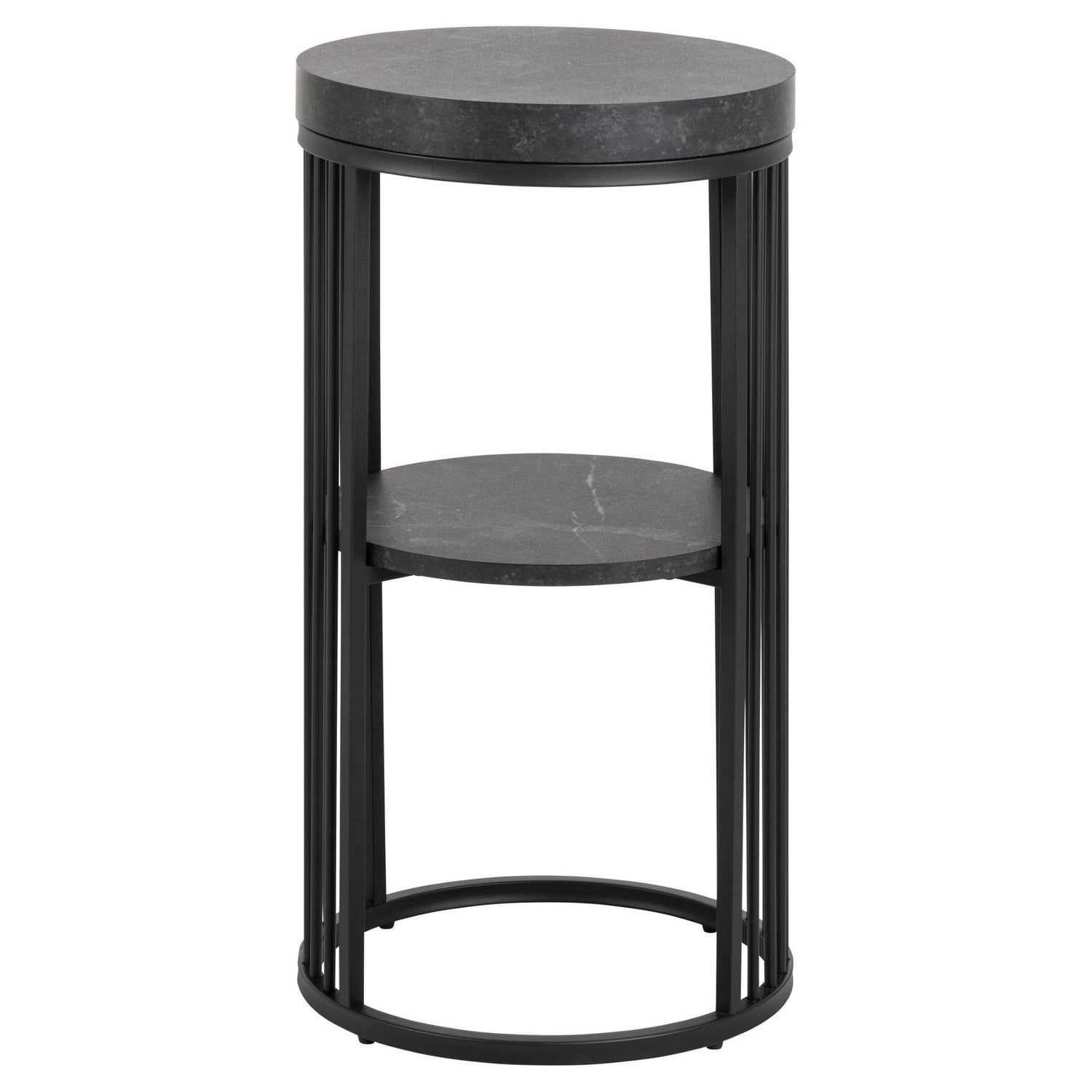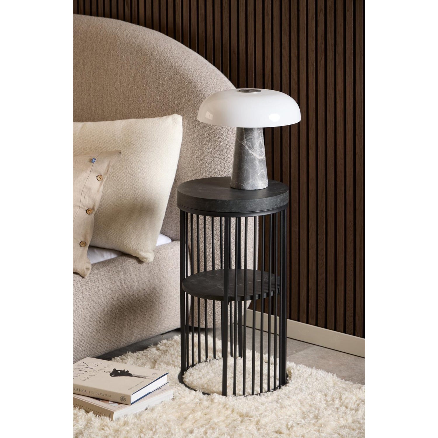 - Distinctiv rund topp och en hylla prydd med en svart marmoreffekt
