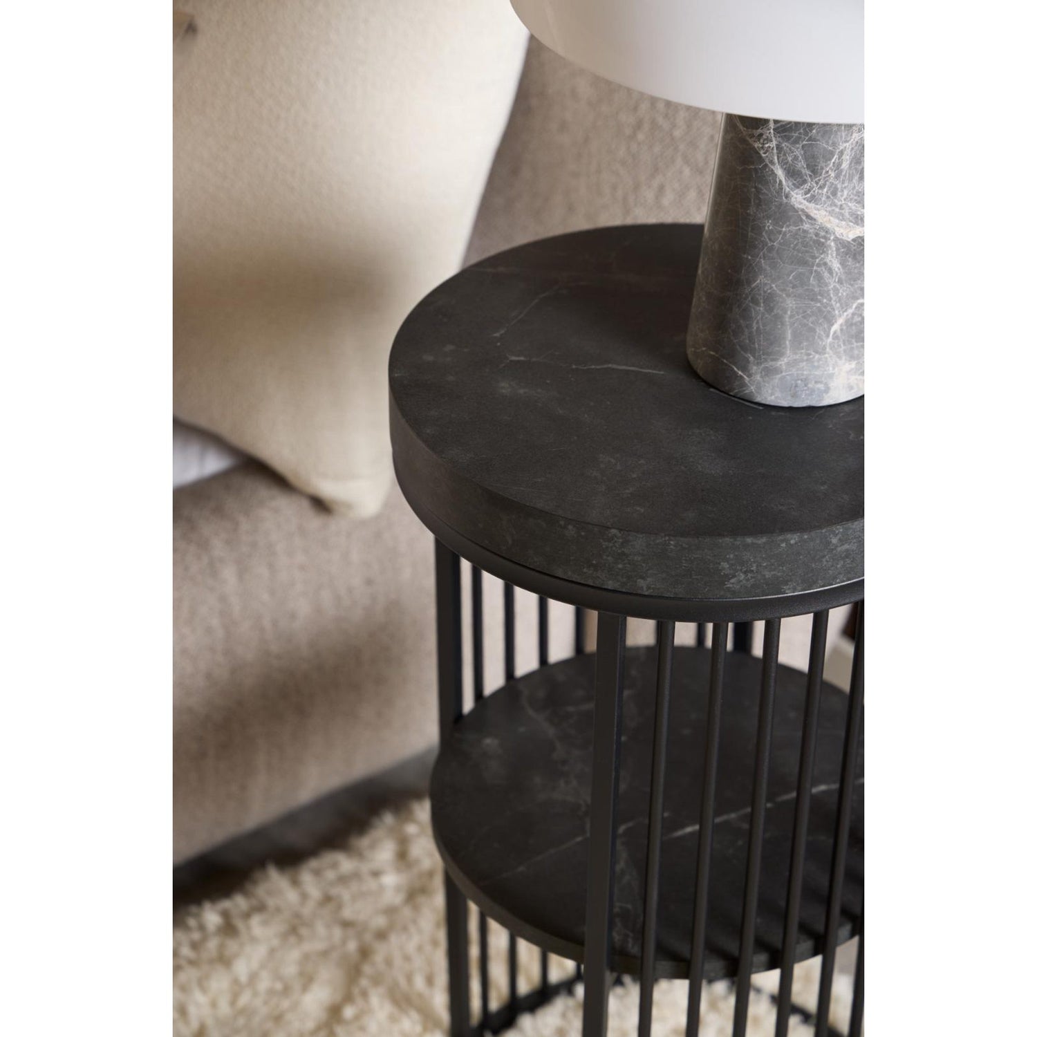 Inspirerad av samtida arkitektur liknar detta nattduksbord en kolonn med sin form och design. Toppen och hyllan, med ett utseende av svart marmor, omges av vertikala trådar, vilket gör nattduksbordet kännas öppet men ändå inneslutet. Den dynamiska interaktionen av element skapar en slående effekt som lämnar ett bestående intryck.