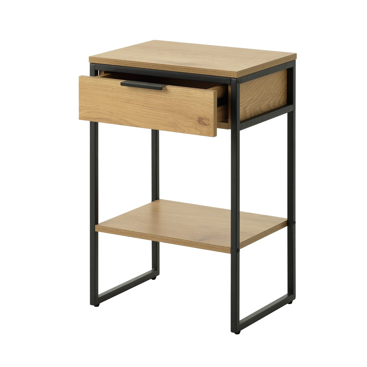 Classico är ett nätt sängbord som kombinerar varm ekkänsla med ett modernt metallstativ. Den lättskötta ytan i melamin med naturlig ekfinish vilar på en svart, pulverlackerad stålram som ger ett luftigt och stabilt uttryck. Den övre lådan rymmer det du vill ha nära till hands, medan den öppna hyllan nedtill passar perfekt för böcker, korgar eller laddare. En lättplacerad nattduksbordslösning som funkar lika bra som sidobord i vardagsrummet.