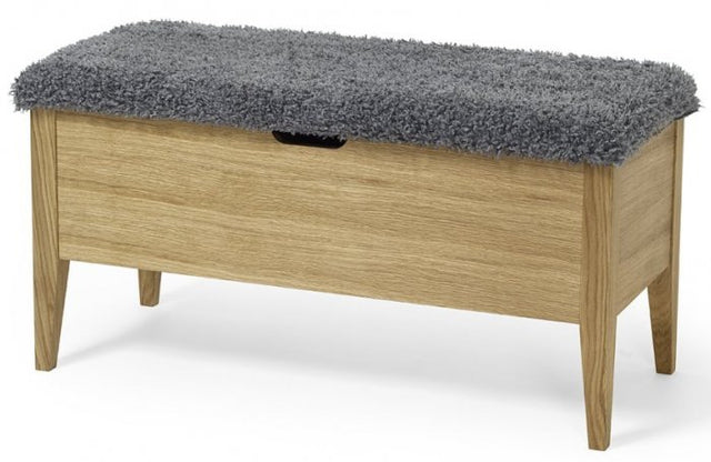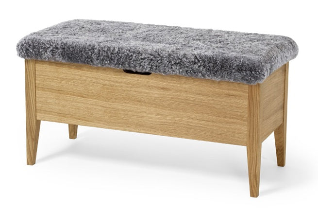 Men Klinte är mer än bara en vacker möbel. Den är också praktisk och flexibel. Välj mellan olika klädslar på toppen – grått ulltyg, grå fårskinnsimitation, äkta fårskinn eller det ljusgråa tyget Chelsea – för att skapa din perfekta kombination. På insidan av bänken finns ett rymligt fack med en praktisk skiljevägg, som är perfekt för att organisera dina saker. Skiljeväggen går att tas bort för att göra plats för större föremål.