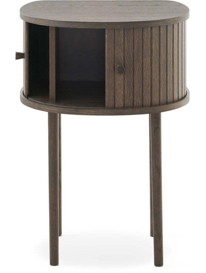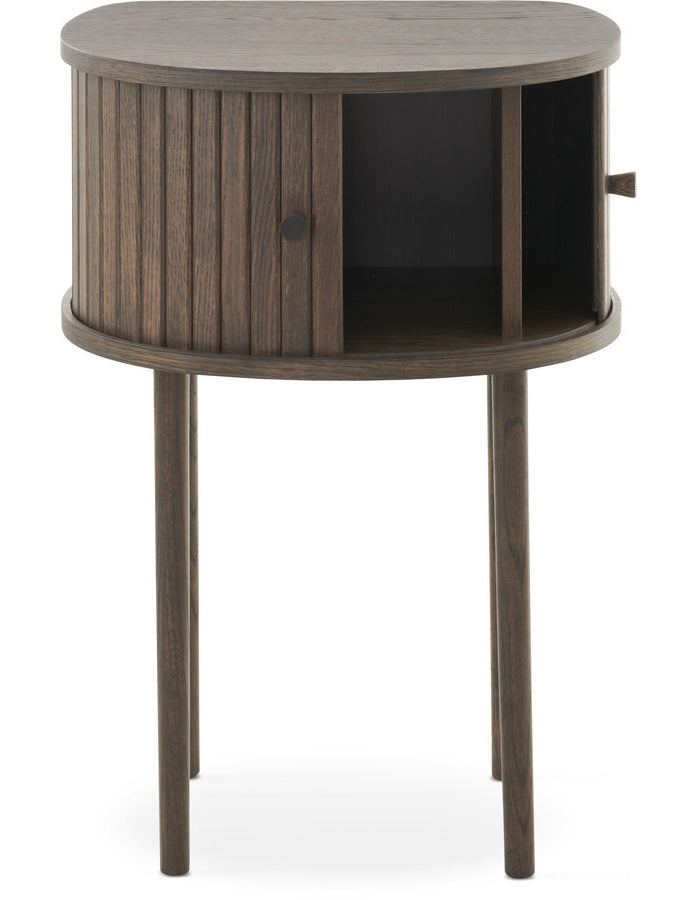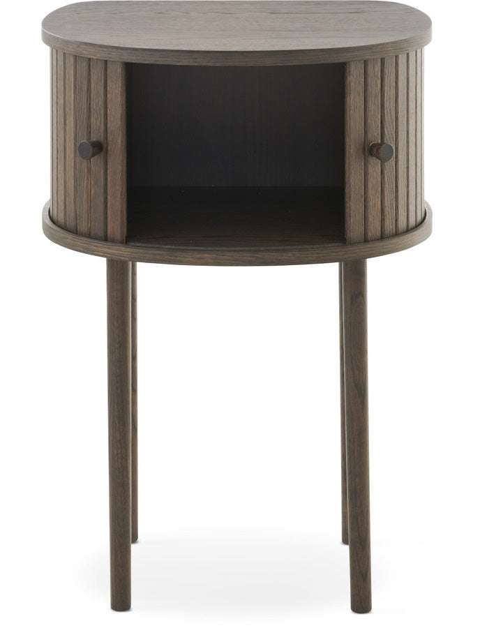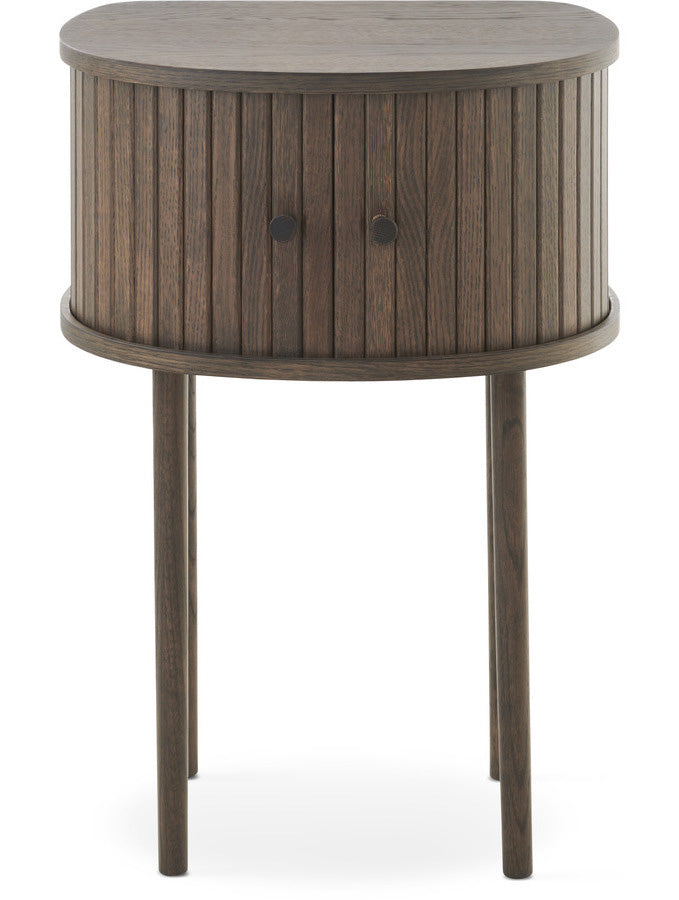 Nilo sängbord från Nestic är en nätt och stilren nattduksbordslösning i brunlackad ek med fanér som framhäver den levande ådringen. Den ovala toppskivan, de rundade gavlarna och den ribbade fronten ger ett elegant uttryck som harmonierar med övriga möbler i serien. De smäckra runda benen gör sängbordet lättplacerat även i mindre sovrum.